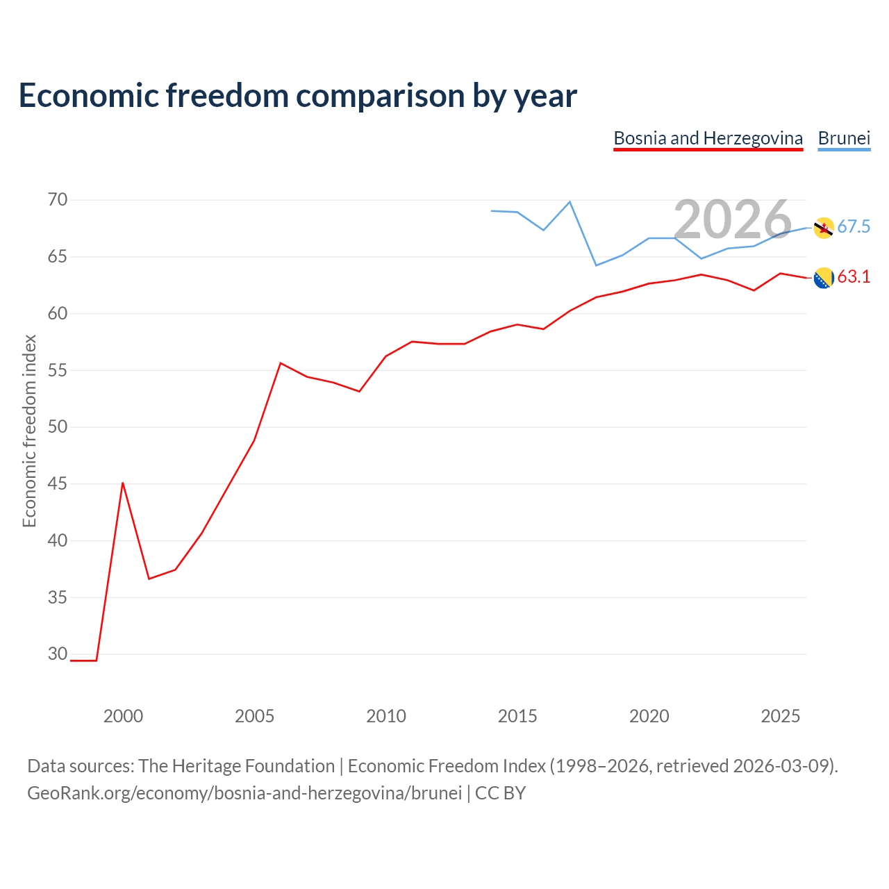 The Economic Freedom Index for Bosnia and Herzegovina is 63.1, ranking 83/197, compared to 67.5 for Brunei, ranking 55/197. The chart above displays a comparison of annual changes in economic freedom indexes.