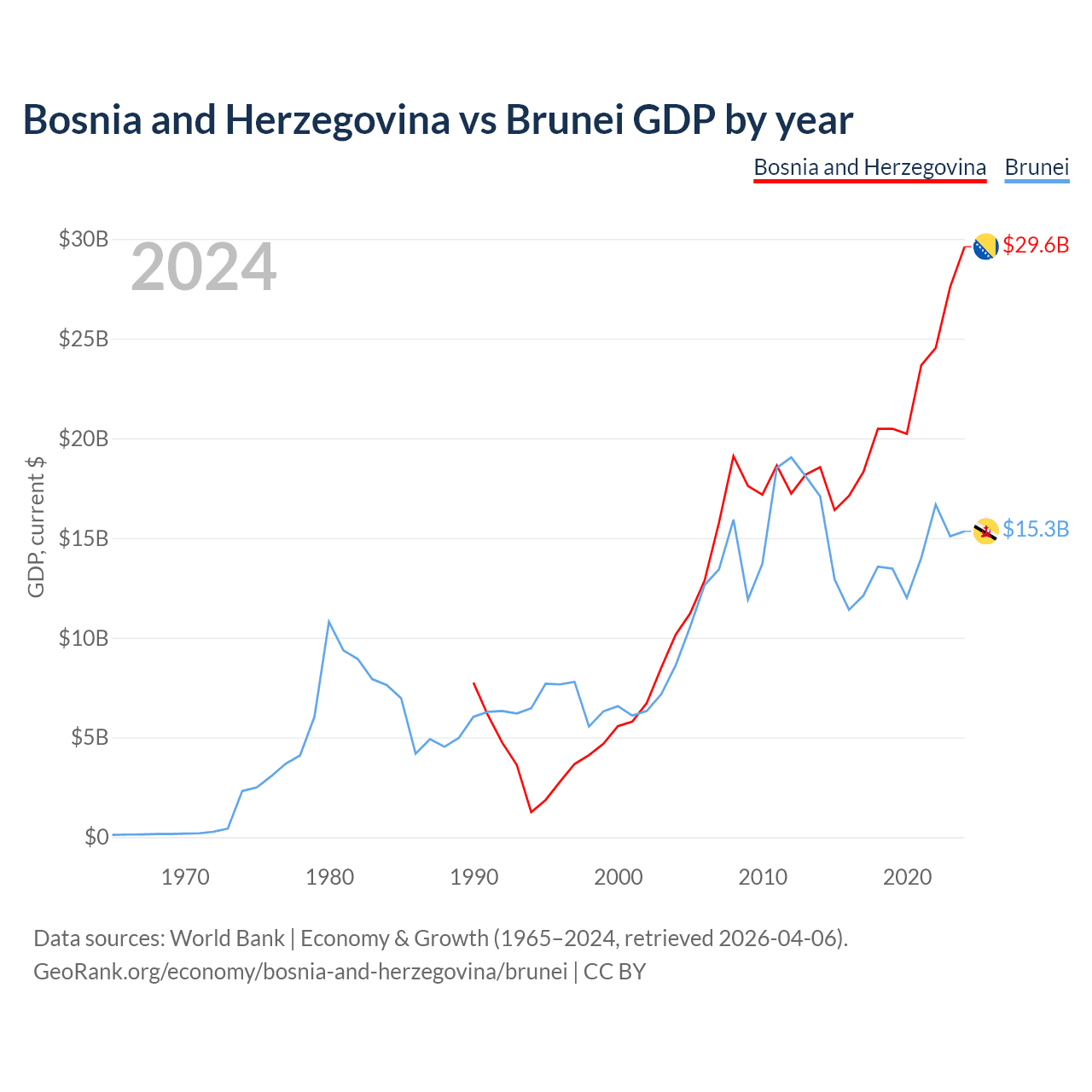 Bosnia and Herzegovina has a GDP of $29.6B compared to $15.3B for Brunei, ranking 111/197 and 142/197 by economy size, respectively.