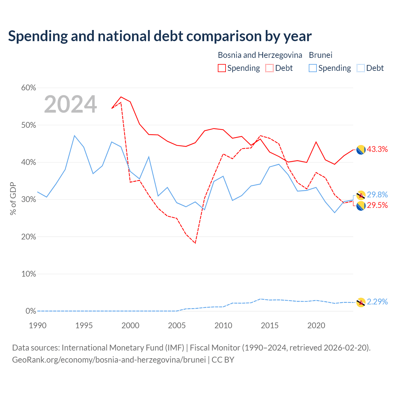 Bosnia and Herzegovina has $8.74B in government debt (29.5% of GDP), compared to $351M (2.29% of GDP) in Brunei.