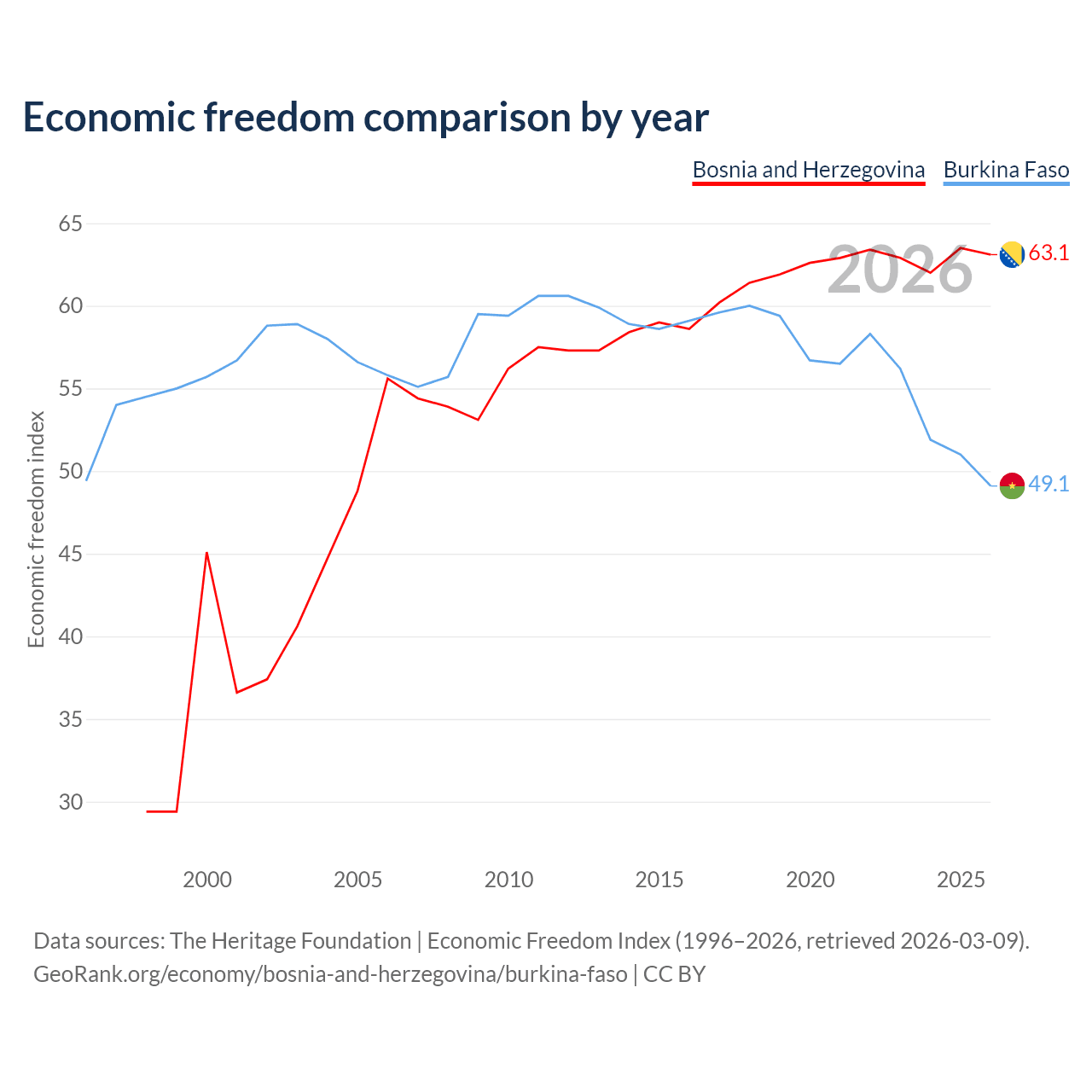 The Economic Freedom Index for Bosnia and Herzegovina is 63.1, ranking 83/197, compared to 49.1 for Burkina Faso, ranking 167/197. The chart above displays a comparison of annual changes in economic freedom indexes.