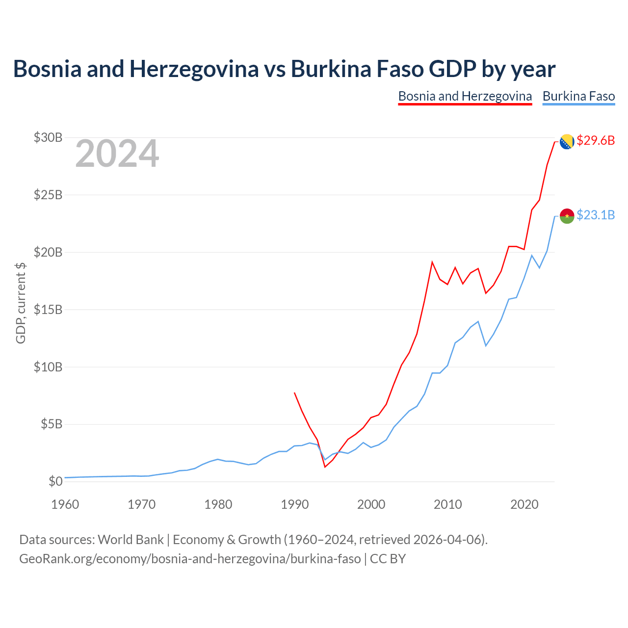 Bosnia and Herzegovina has a GDP of $29.6B compared to $23.1B for Burkina Faso, ranking 111/197 and 122/197 by economy size, respectively.