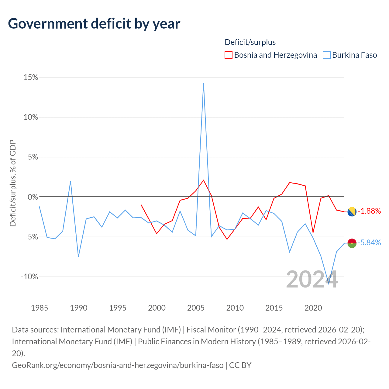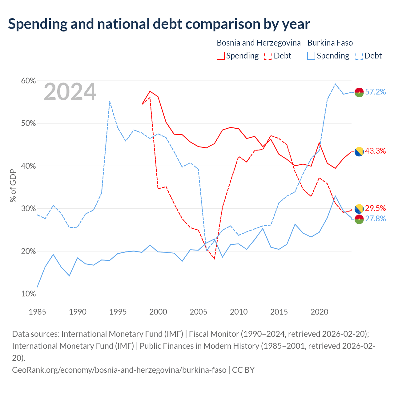 Bosnia and Herzegovina has $8.74B in government debt (29.5% of GDP), compared to $13.2B (57.2% of GDP) in Burkina Faso.