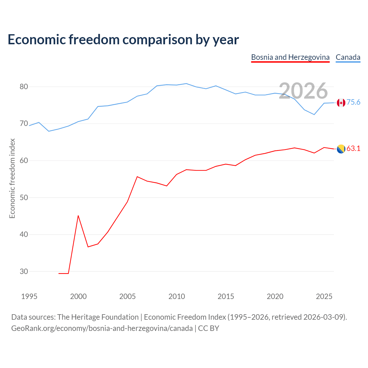 The Economic Freedom Index for Bosnia and Herzegovina is 63.1, ranking 83/197, compared to 75.6 for Canada, ranking 17/197. The chart above displays a comparison of annual changes in economic freedom indexes.