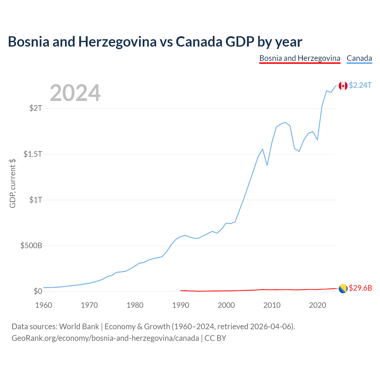 Bosnia and Herzegovina has a GDP of $29.6B compared to $2.24T for Canada, ranking 111/197 and 9/197 by economy size, respectively.