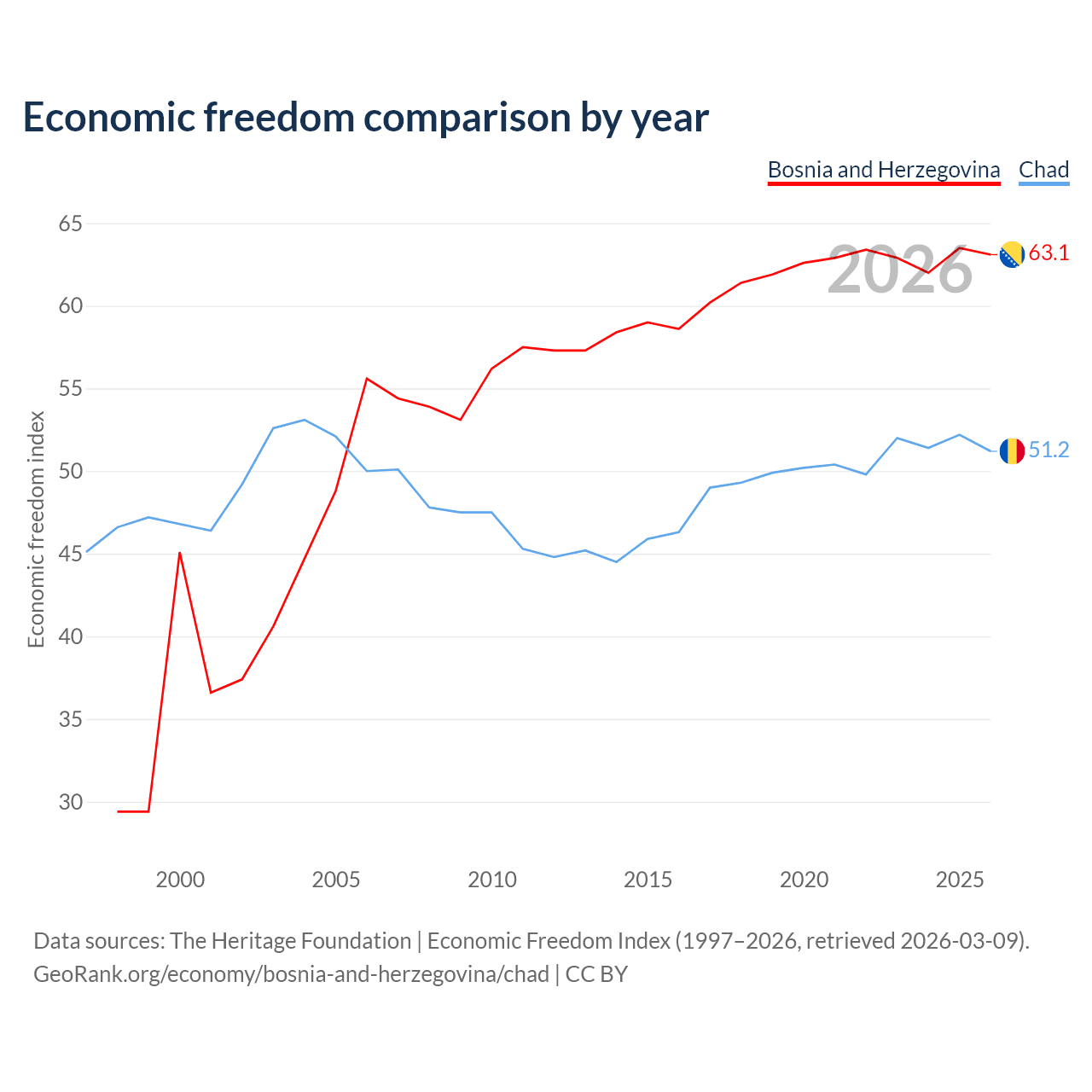 The Economic Freedom Index for Bosnia and Herzegovina is 63.1, ranking 83/197, compared to 51.2 for Chad, ranking 154/197. The chart above displays a comparison of annual changes in economic freedom indexes.