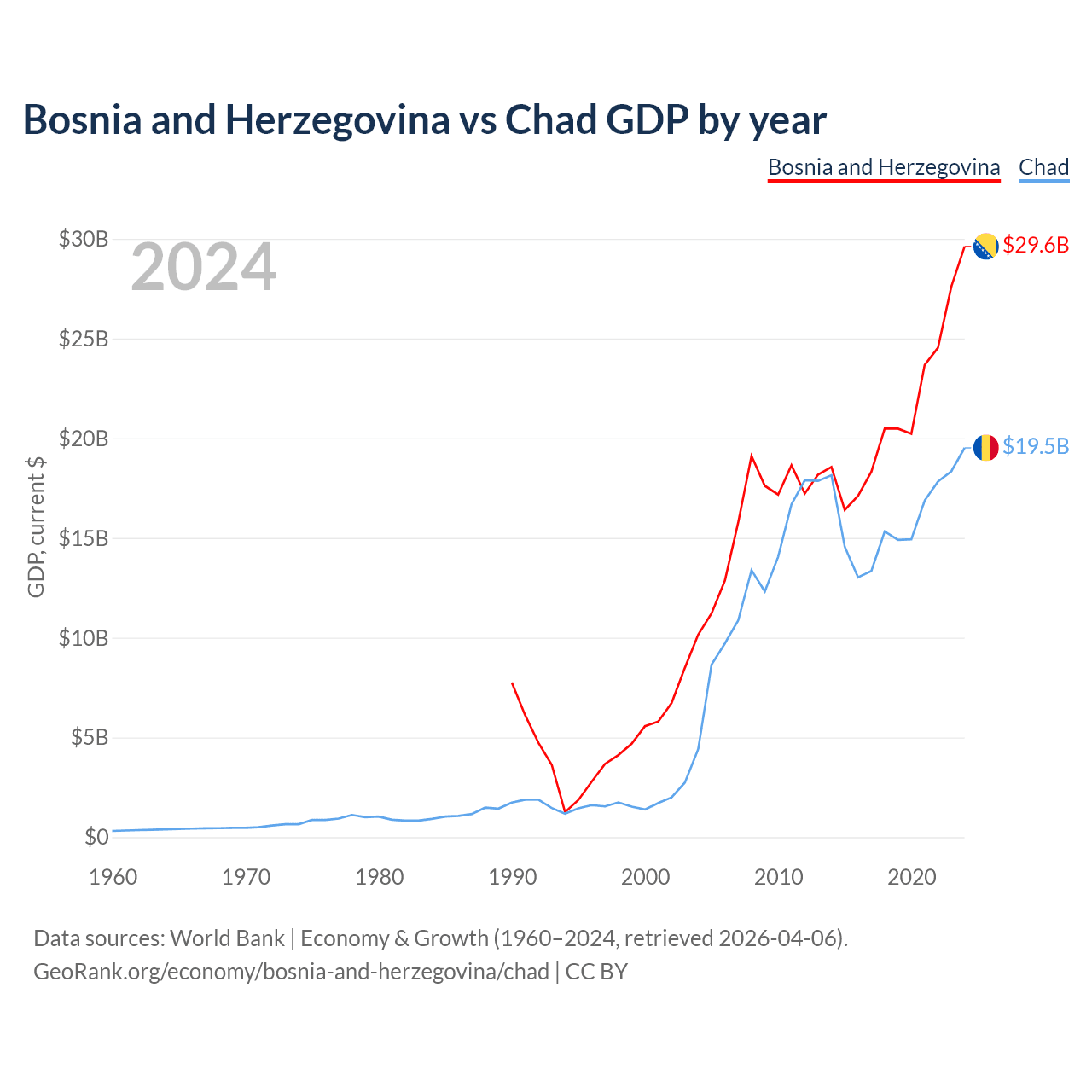Bosnia and Herzegovina has a GDP of $29.6B compared to $19.5B for Chad, ranking 111/197 and 132/197 by economy size, respectively.