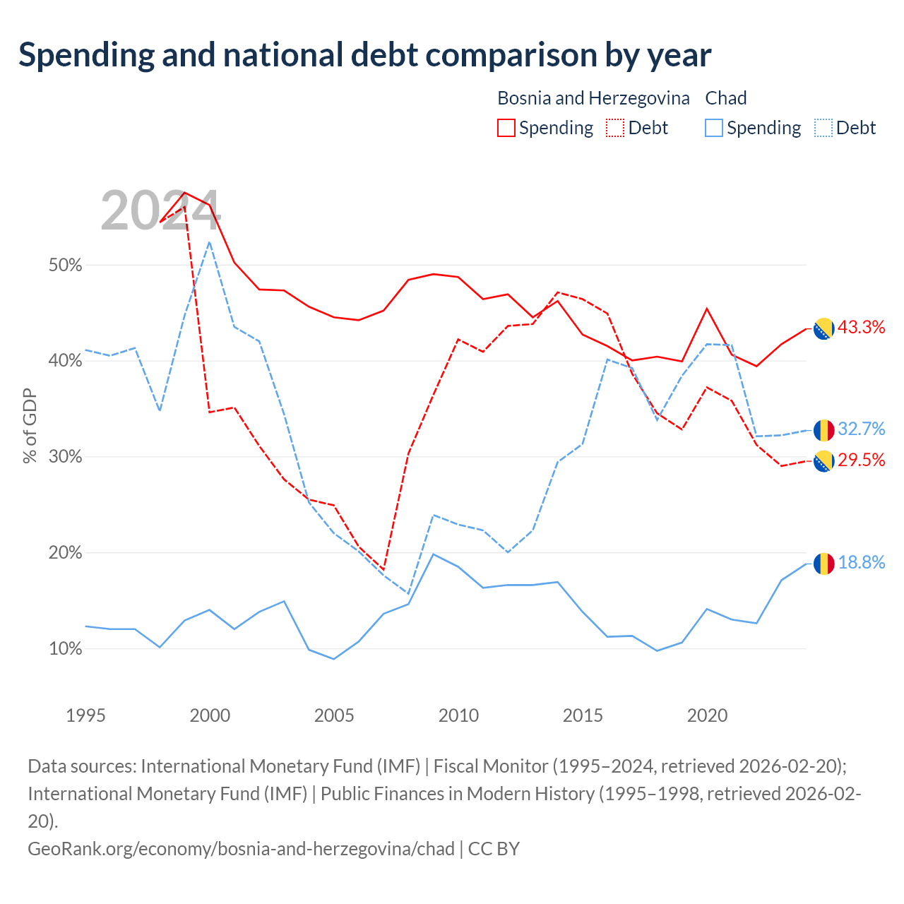 Bosnia and Herzegovina has $8.74B in government debt (29.5% of GDP), compared to $6.37B (32.7% of GDP) in Chad.