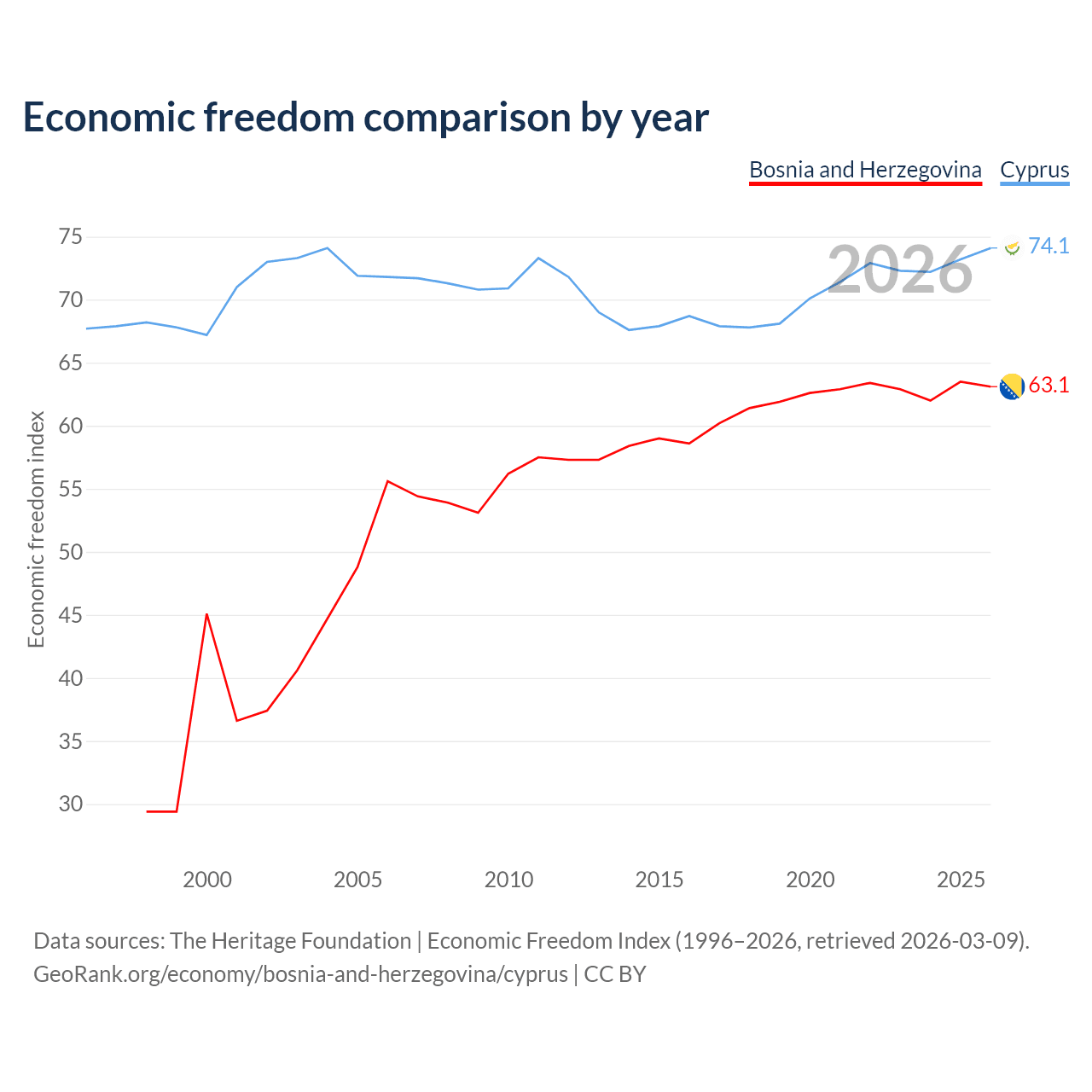 The Economic Freedom Index for Bosnia and Herzegovina is 63.1, ranking 83/197, compared to 74.1 for Cyprus, ranking 21/197. The chart above displays a comparison of annual changes in economic freedom indexes.