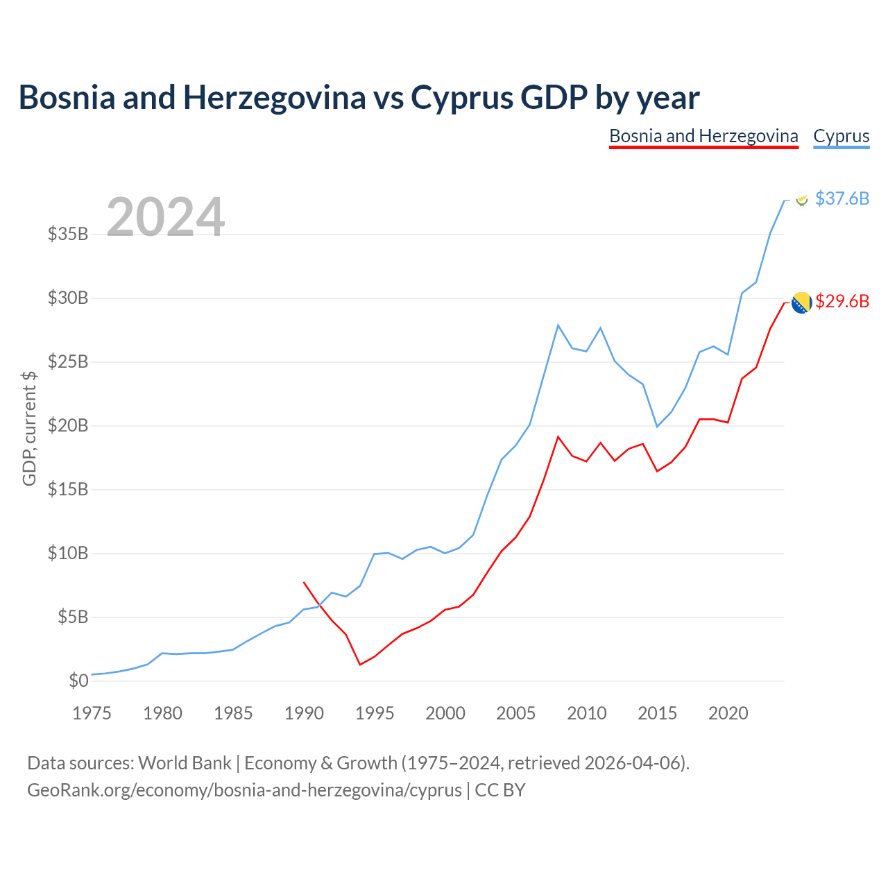 Bosnia and Herzegovina has a GDP of $29.6B compared to $37.6B for Cyprus, ranking 111/197 and 103/197 by economy size, respectively.
