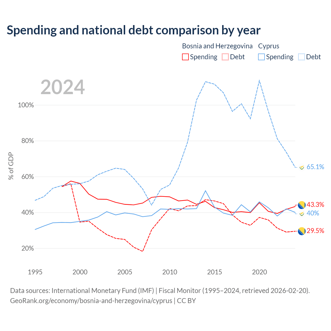 Bosnia and Herzegovina has $8.74B in government debt (29.5% of GDP), compared to $24.5B (65.1% of GDP) in Cyprus.
