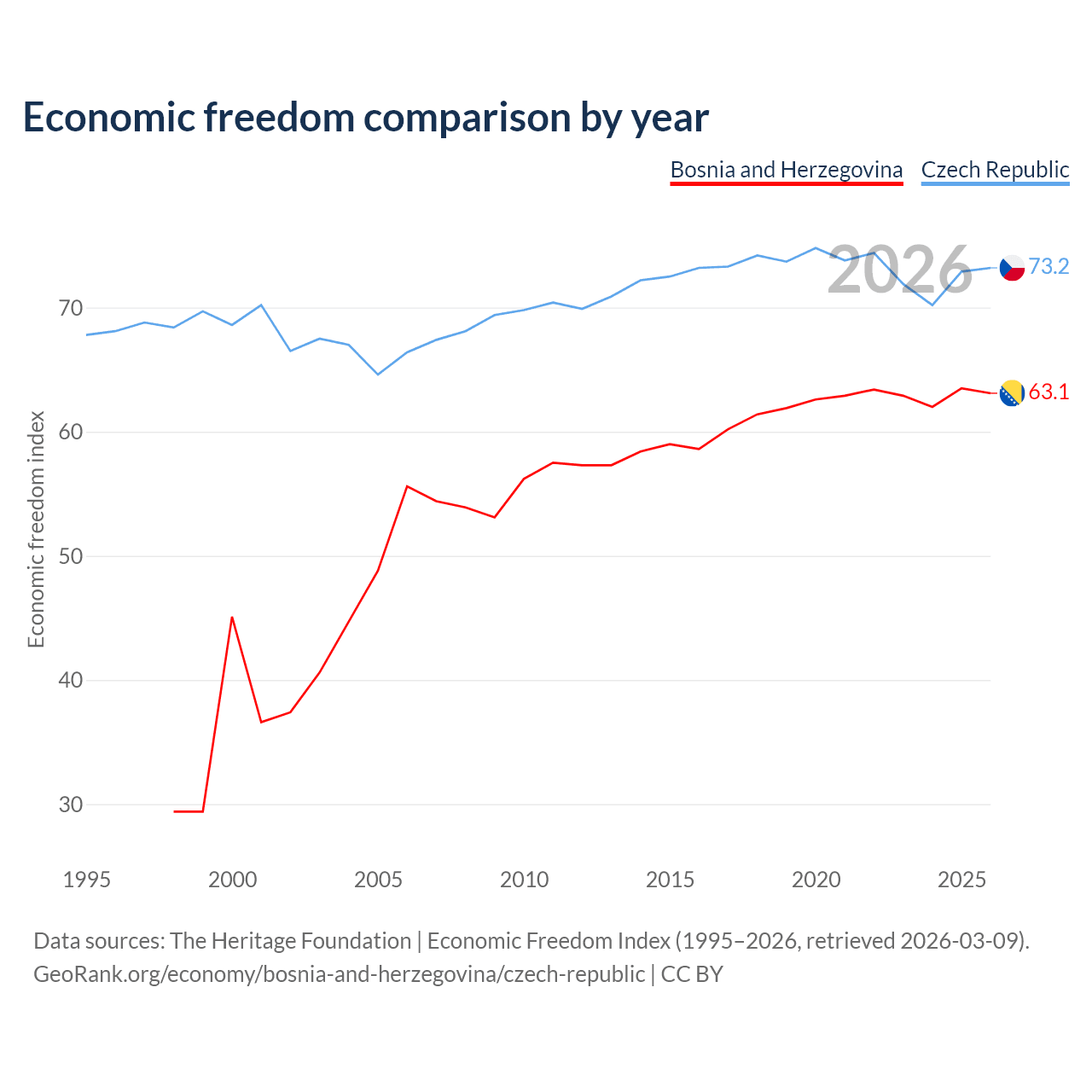 The Economic Freedom Index for Bosnia and Herzegovina is 63.1, ranking 83/197, compared to 73.2 for the Czech Republic, ranking 25/197. The chart above displays a comparison of annual changes in economic freedom indexes.