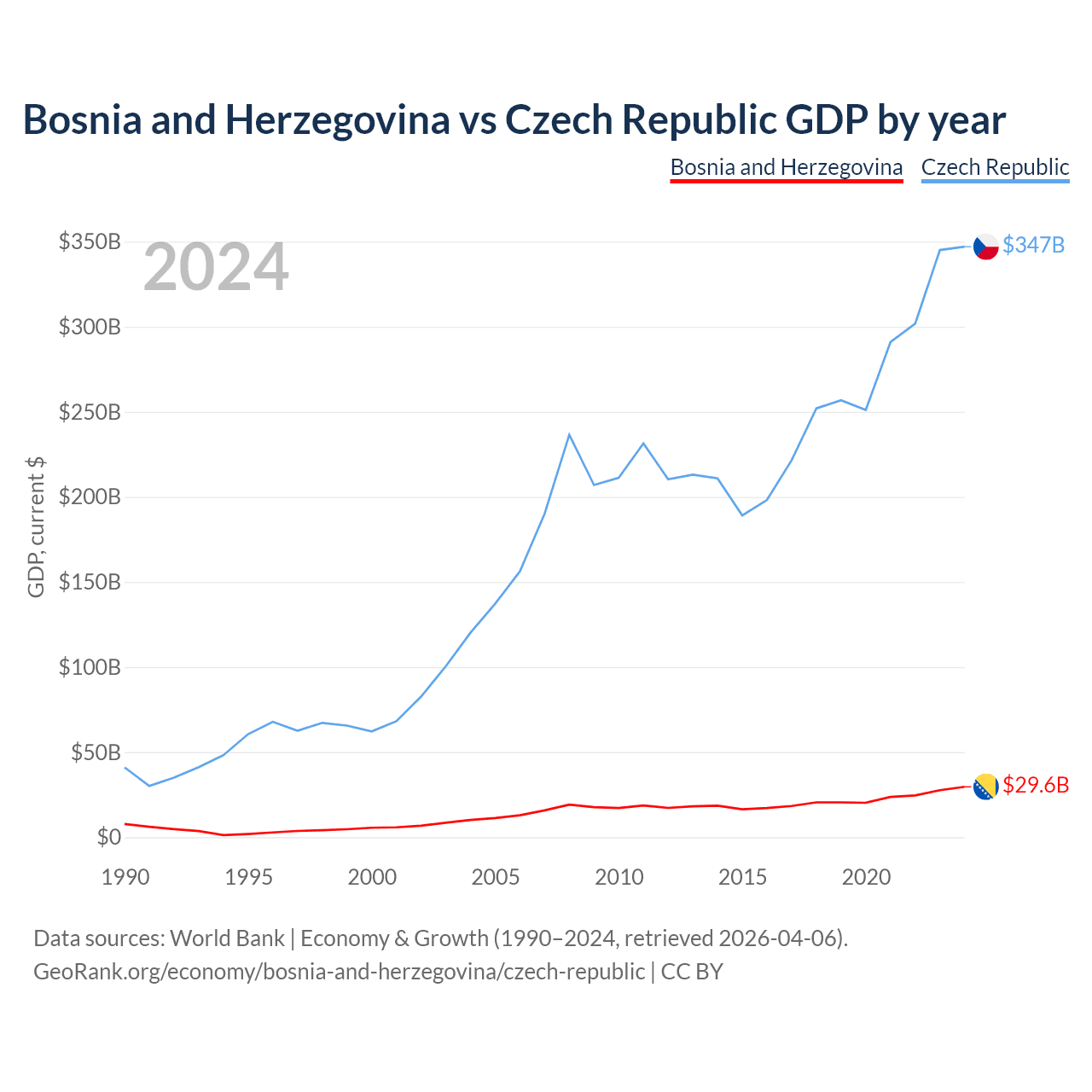 Bosnia and Herzegovina has a GDP of $29.6B compared to $347B for the Czech Republic, ranking 111/197 and 44/197 by economy size, respectively.