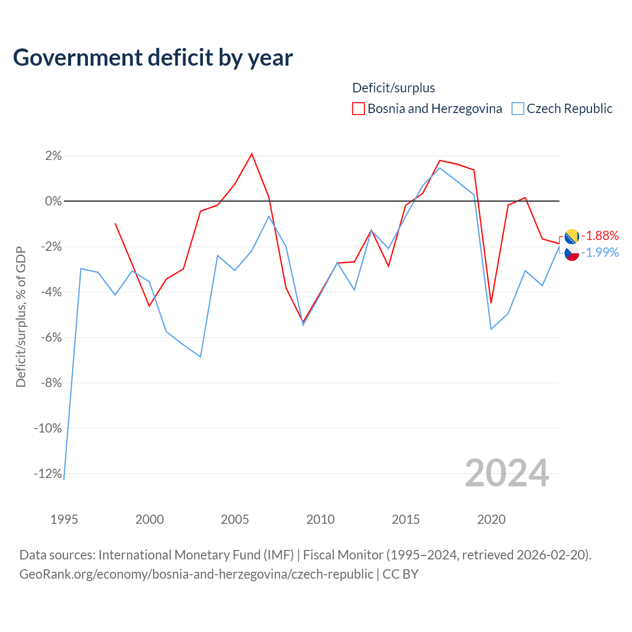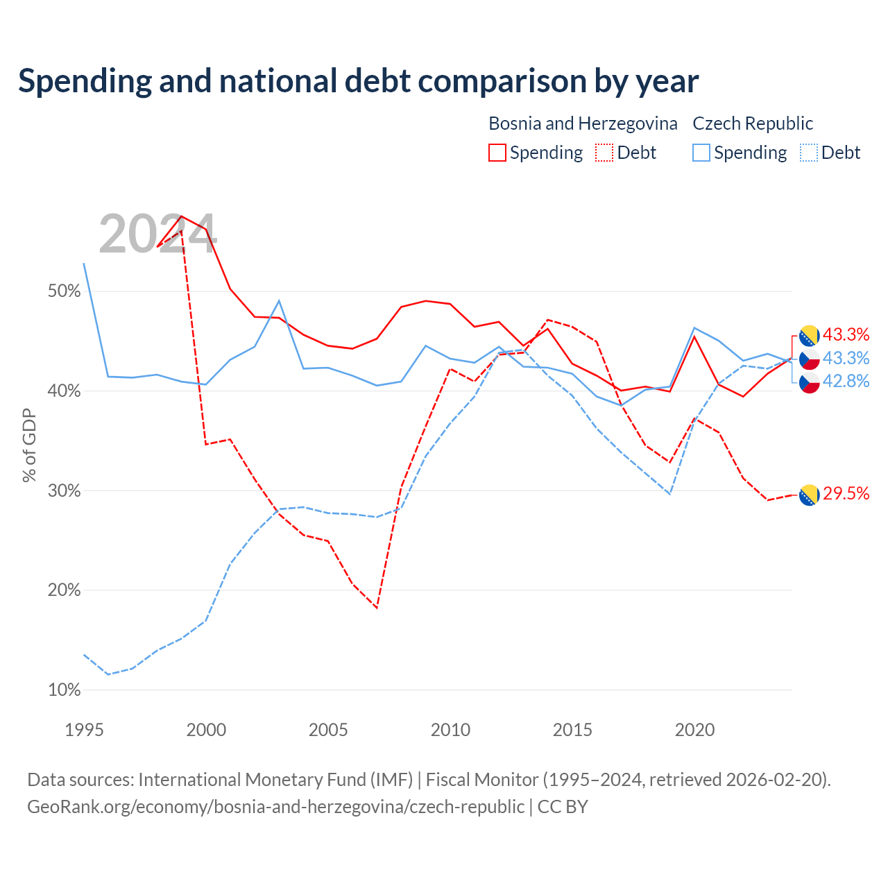 Bosnia and Herzegovina has $8.74B in government debt (29.5% of GDP), compared to $150B (43.3% of GDP) in the Czech Republic.