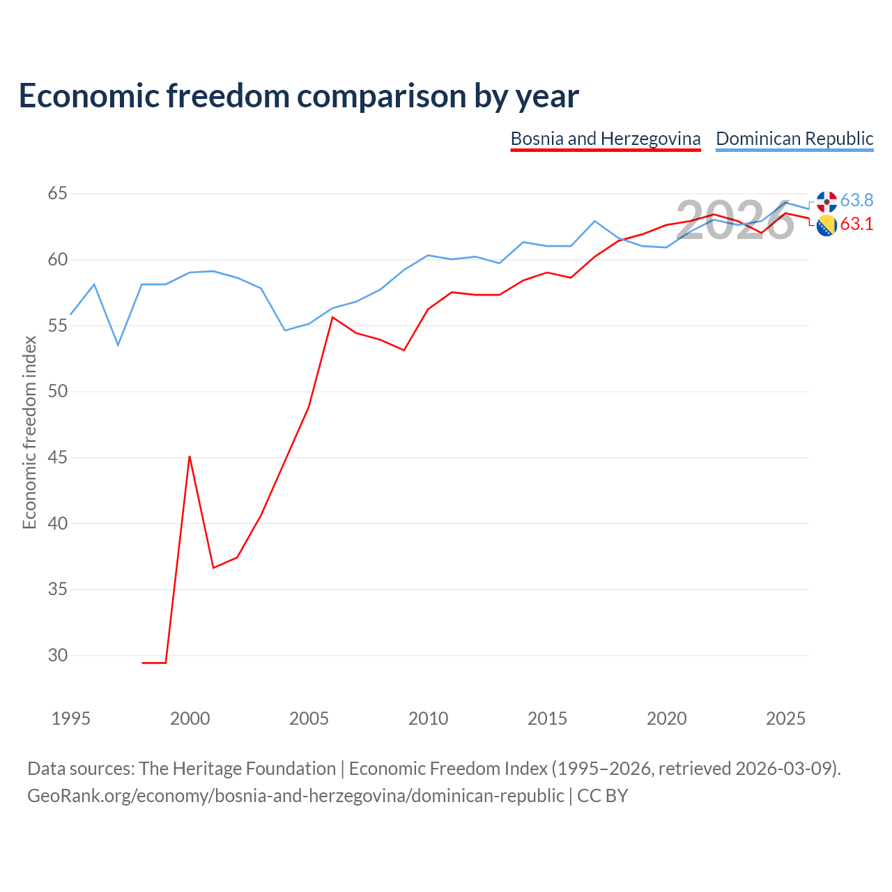 The Economic Freedom Index for Bosnia and Herzegovina is 63.1, ranking 83/197, compared to 63.8 for the Dominican Republic, ranking 77/197. The chart above displays a comparison of annual changes in economic freedom indexes.