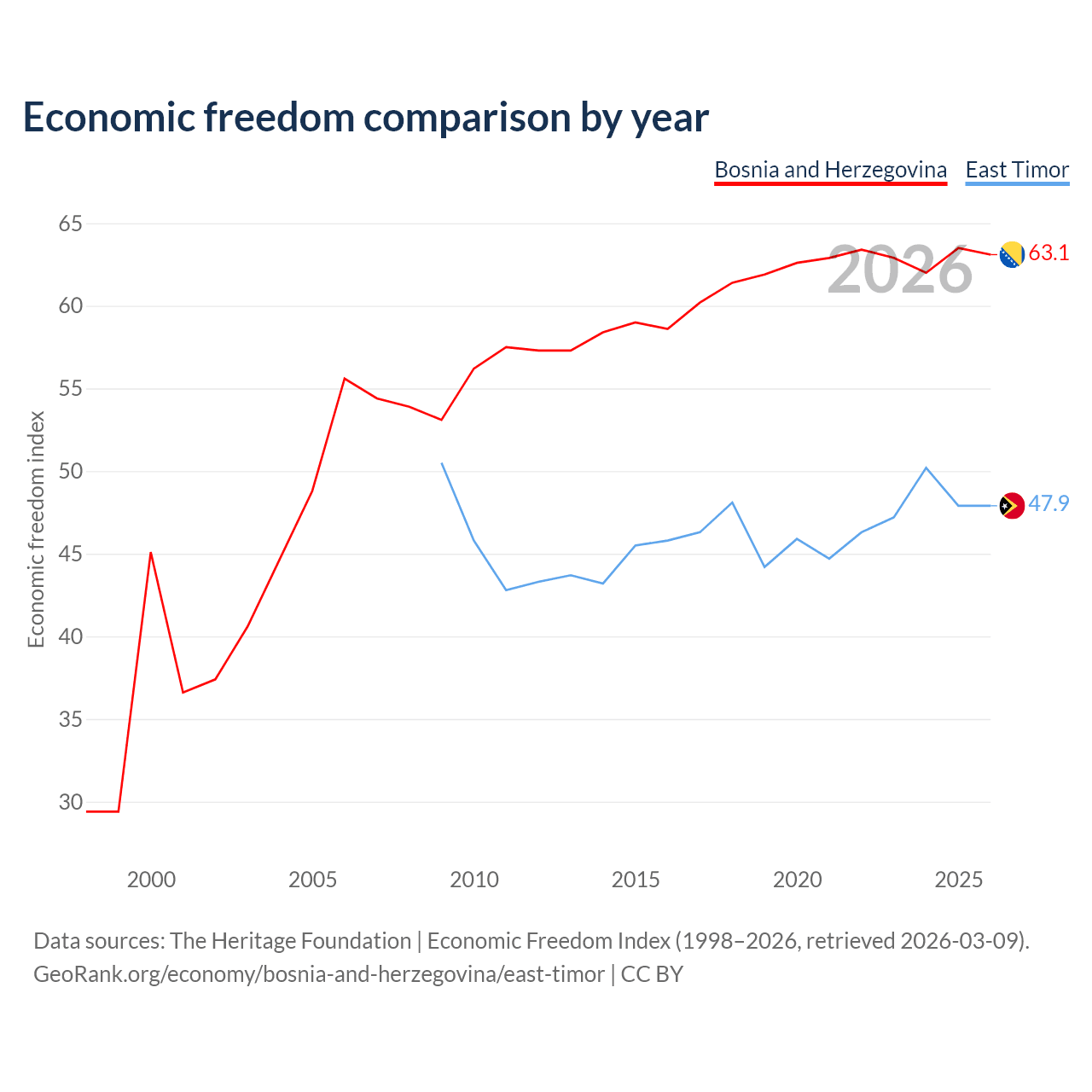 The Economic Freedom Index for Bosnia and Herzegovina is 63.1, ranking 83/197, compared to 47.9 for East Timor, ranking 173/197. The chart above displays a comparison of annual changes in economic freedom indexes.
