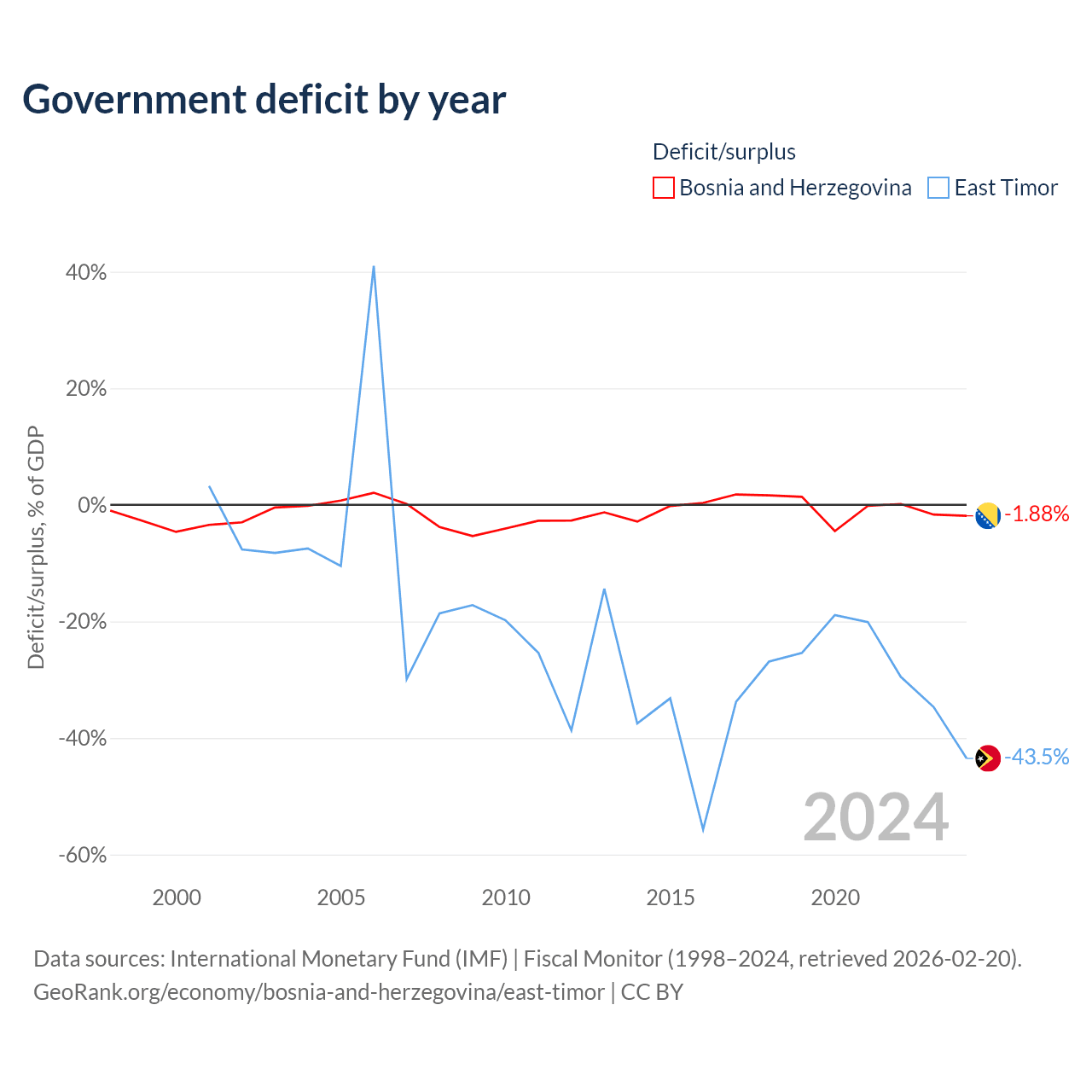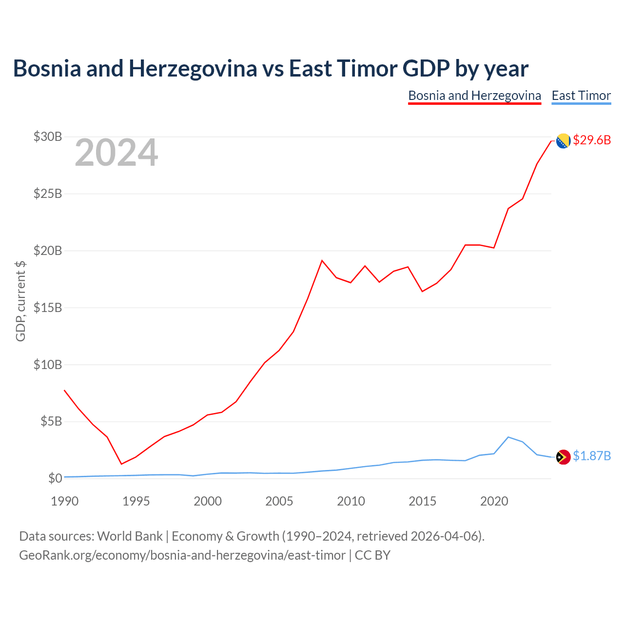 Bosnia and Herzegovina has a GDP of $29.6B compared to $1.87B for East Timor, ranking 111/197 and 181/197 by economy size, respectively.