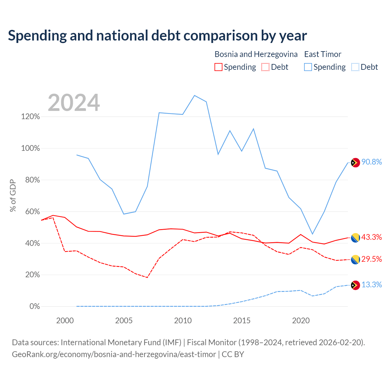 Bosnia and Herzegovina has $8.74B in government debt (29.5% of GDP), compared to $249M (13.3% of GDP) in East Timor.