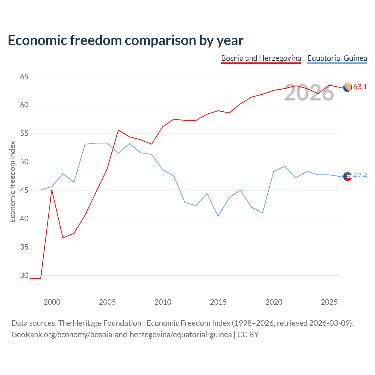 The Economic Freedom Index for Bosnia and Herzegovina is 63.1, ranking 83/197, compared to 47.4 for Equatorial Guinea, ranking 175/197. The chart above displays a comparison of annual changes in economic freedom indexes.