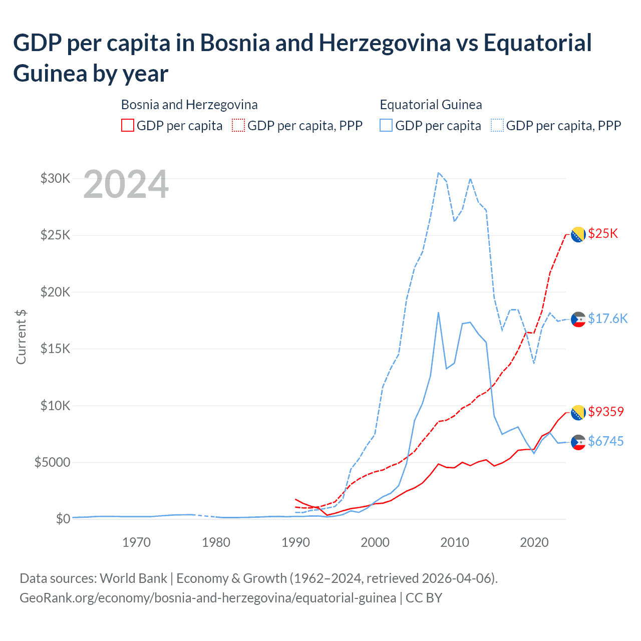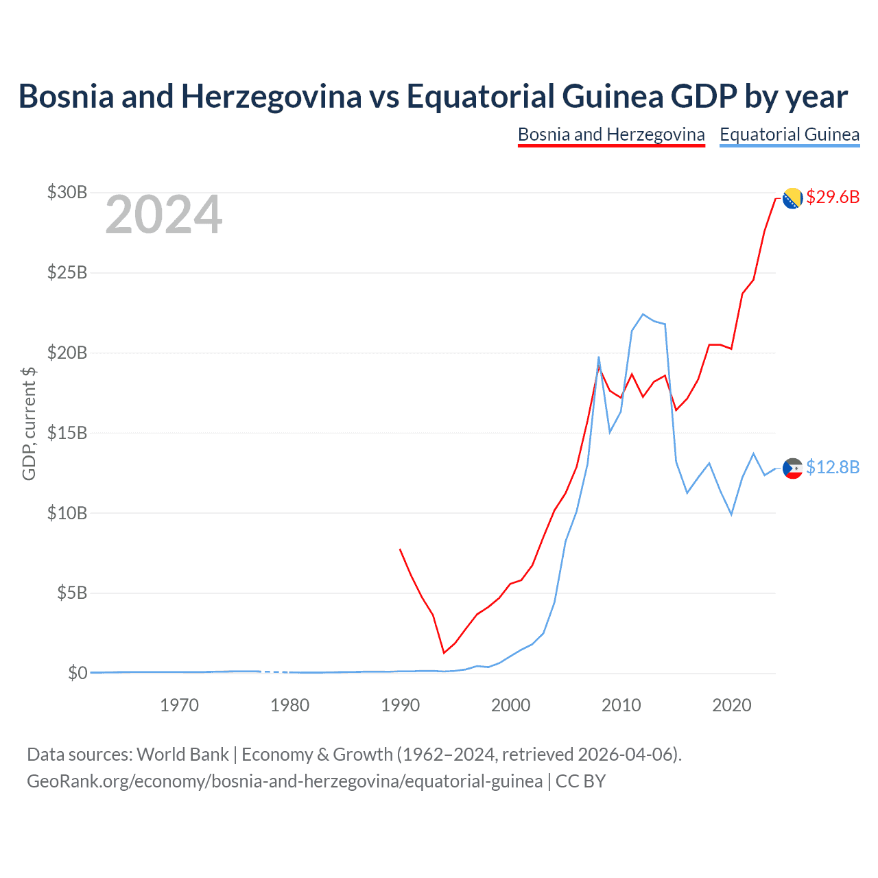 Bosnia and Herzegovina has a GDP of $29.6B compared to $12.8B for Equatorial Guinea, ranking 111/197 and 148/197 by economy size, respectively.