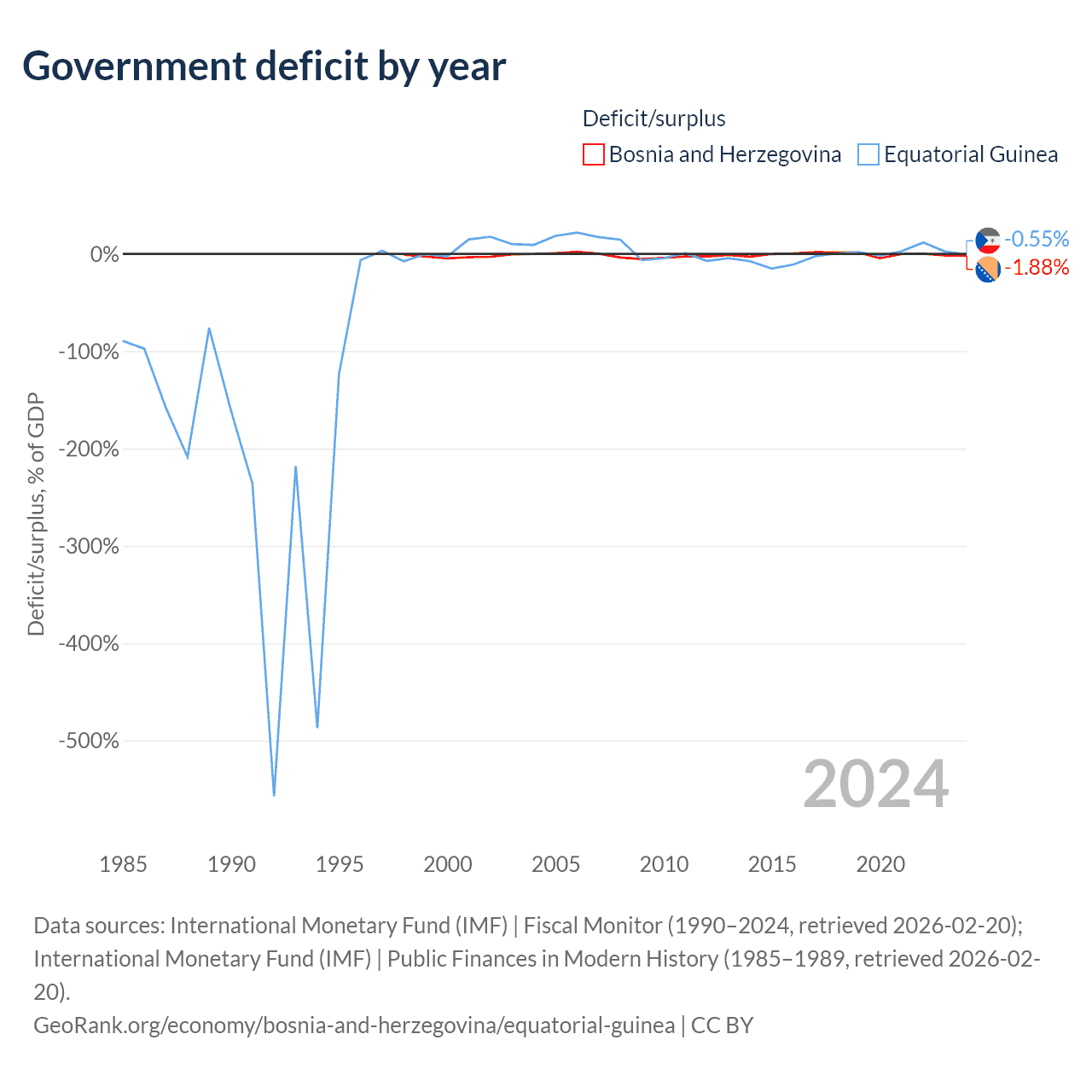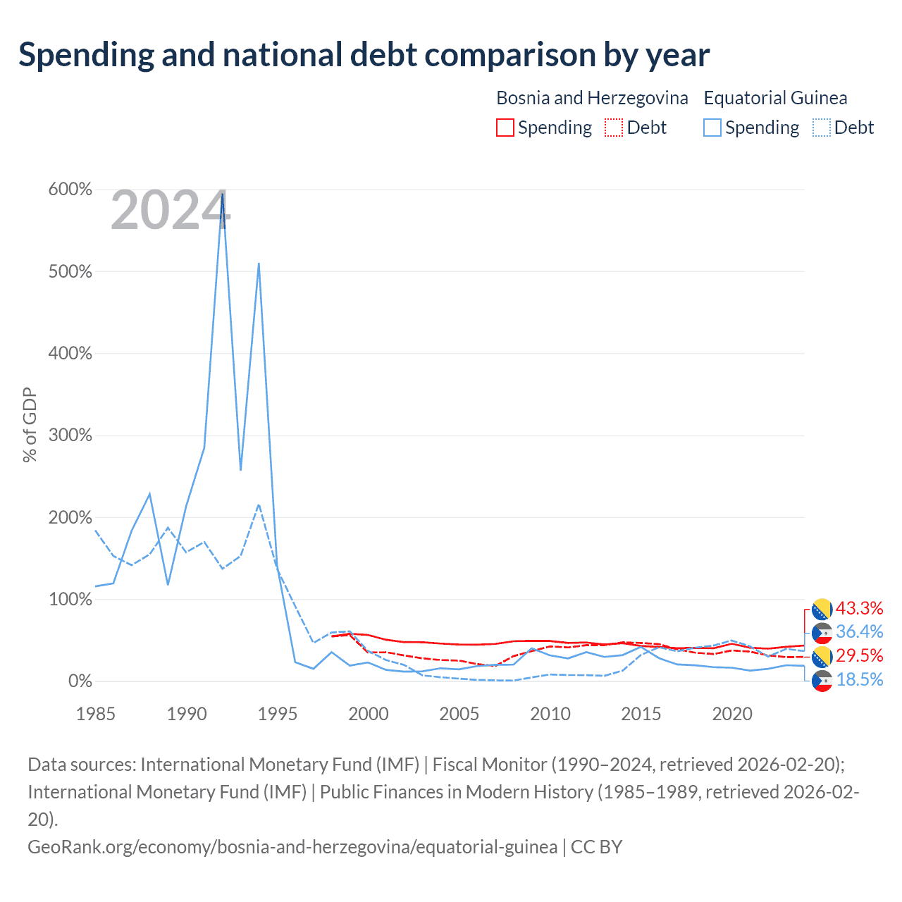 Bosnia and Herzegovina has $8.74B in government debt (29.5% of GDP), compared to $4.65B (36.4% of GDP) in Equatorial Guinea.