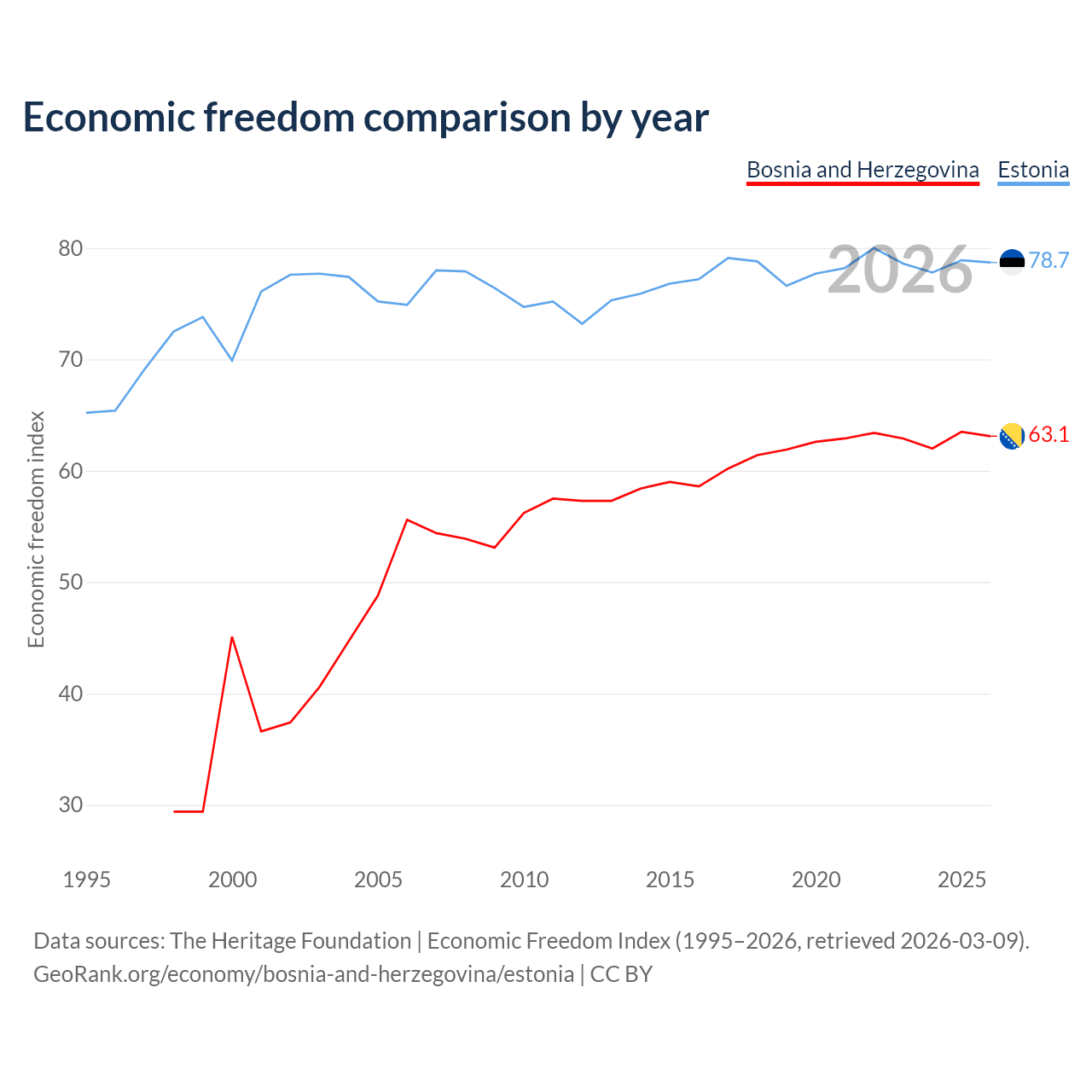 The Economic Freedom Index for Bosnia and Herzegovina is 63.1, ranking 83/197, compared to 78.7 for Estonia, ranking 10/197. The chart above displays a comparison of annual changes in economic freedom indexes.