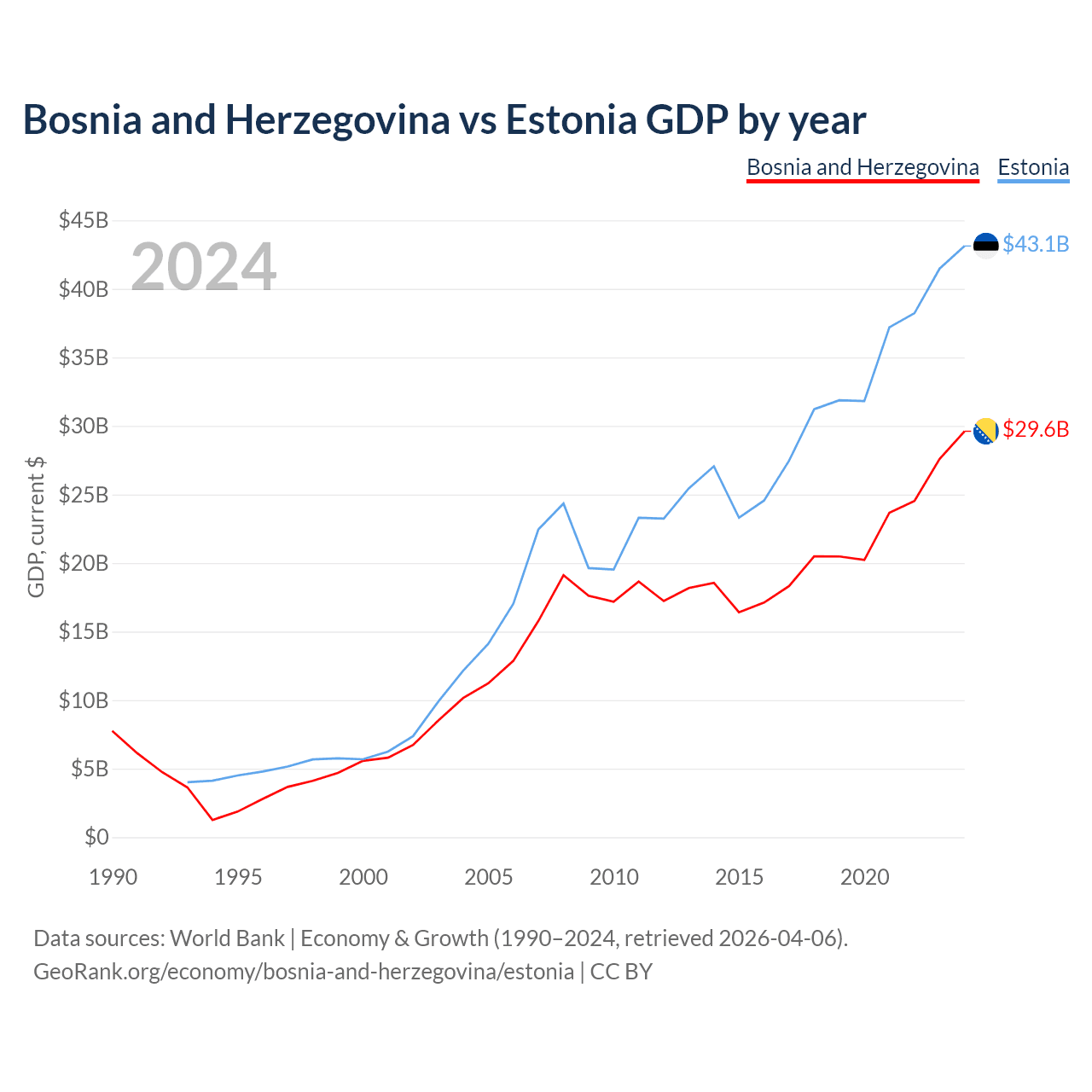 Bosnia and Herzegovina has a GDP of $29.6B compared to $43.1B for Estonia, ranking 111/197 and 100/197 by economy size, respectively.