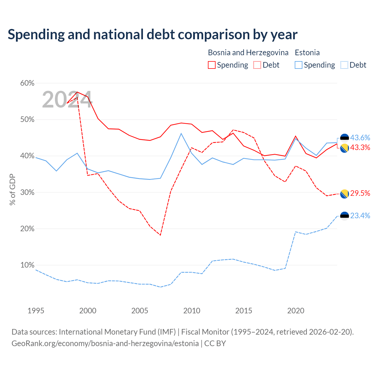 Bosnia and Herzegovina has $8.74B in government debt (29.5% of GDP), compared to $10.1B (23.4% of GDP) in Estonia.