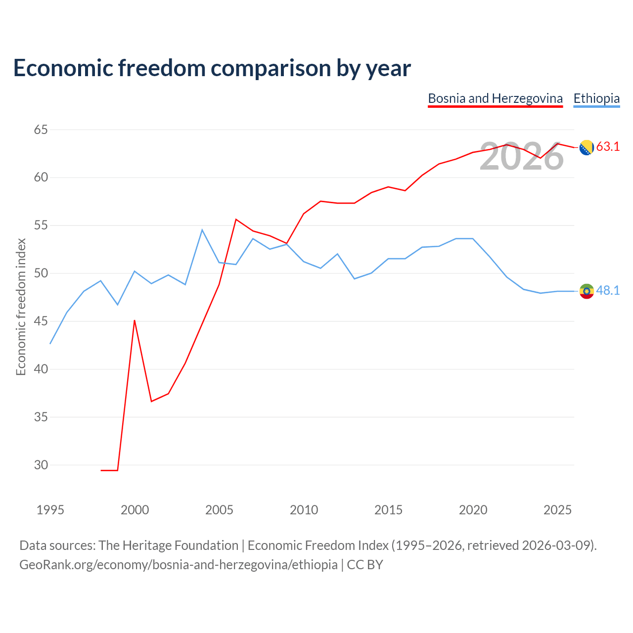 The Economic Freedom Index for Bosnia and Herzegovina is 63.1, ranking 83/197, compared to 48.1 for Ethiopia, ranking 171/197. The chart above displays a comparison of annual changes in economic freedom indexes.