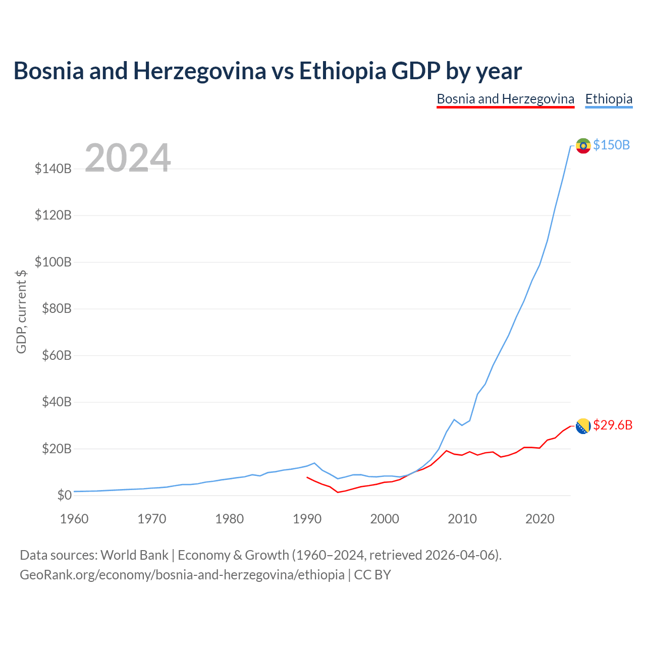 Bosnia and Herzegovina has a GDP of $29.6B compared to $150B for Ethiopia, ranking 111/197 and 60/197 by economy size, respectively.