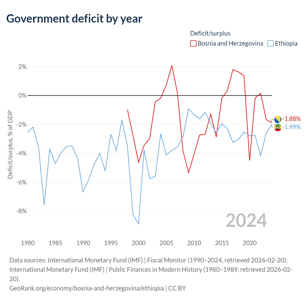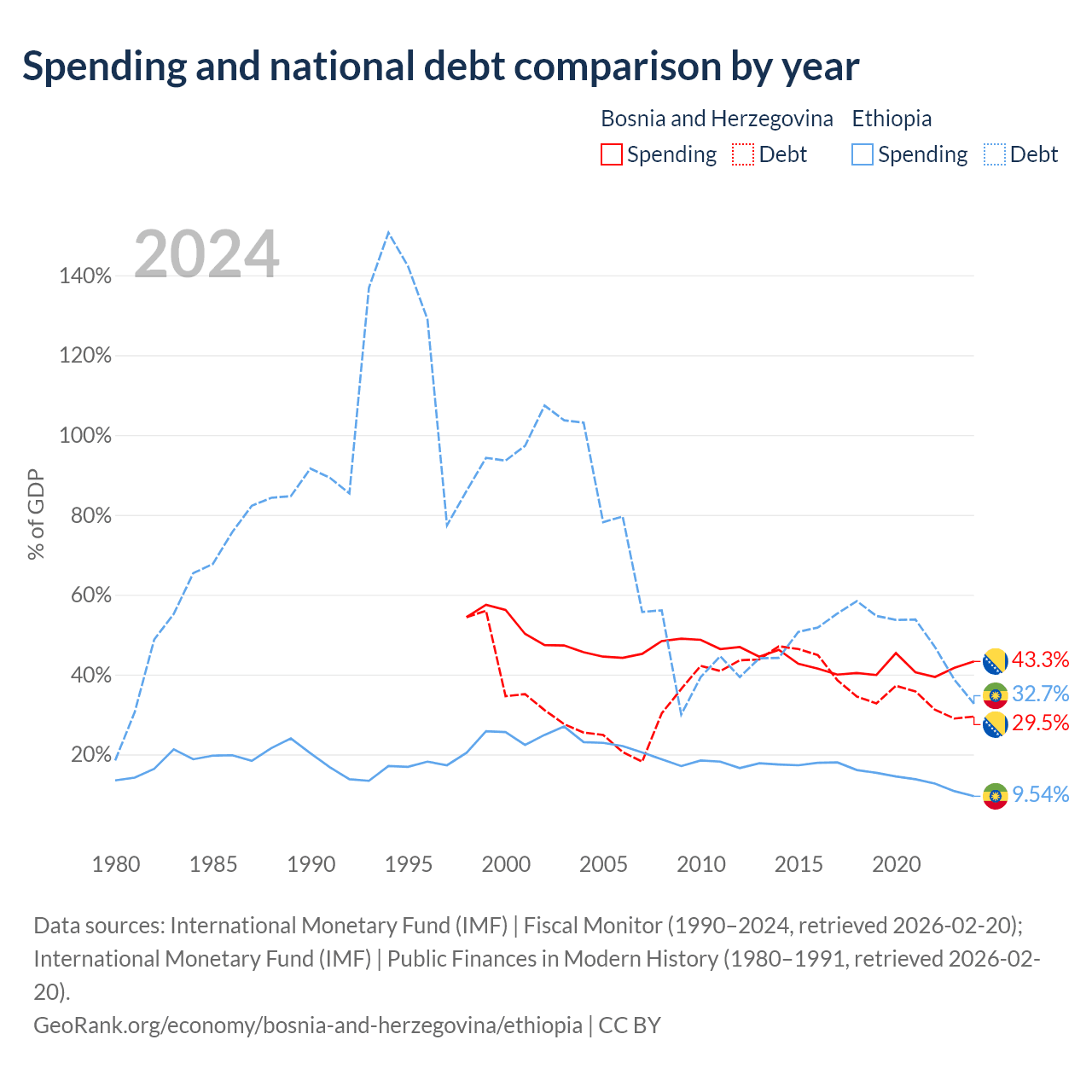 Bosnia and Herzegovina has $8.74B in government debt (29.5% of GDP), compared to $48.9B (32.7% of GDP) in Ethiopia.