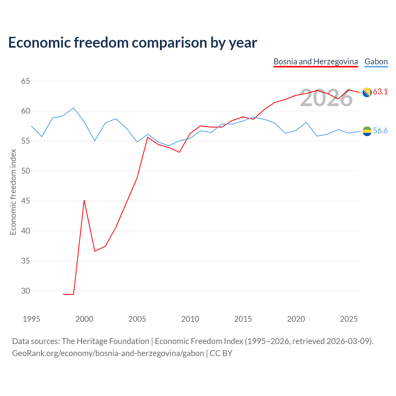 The Economic Freedom Index for Bosnia and Herzegovina is 63.1, ranking 83/197, compared to 56.6 for Gabon, ranking 120/197. The chart above displays a comparison of annual changes in economic freedom indexes.
