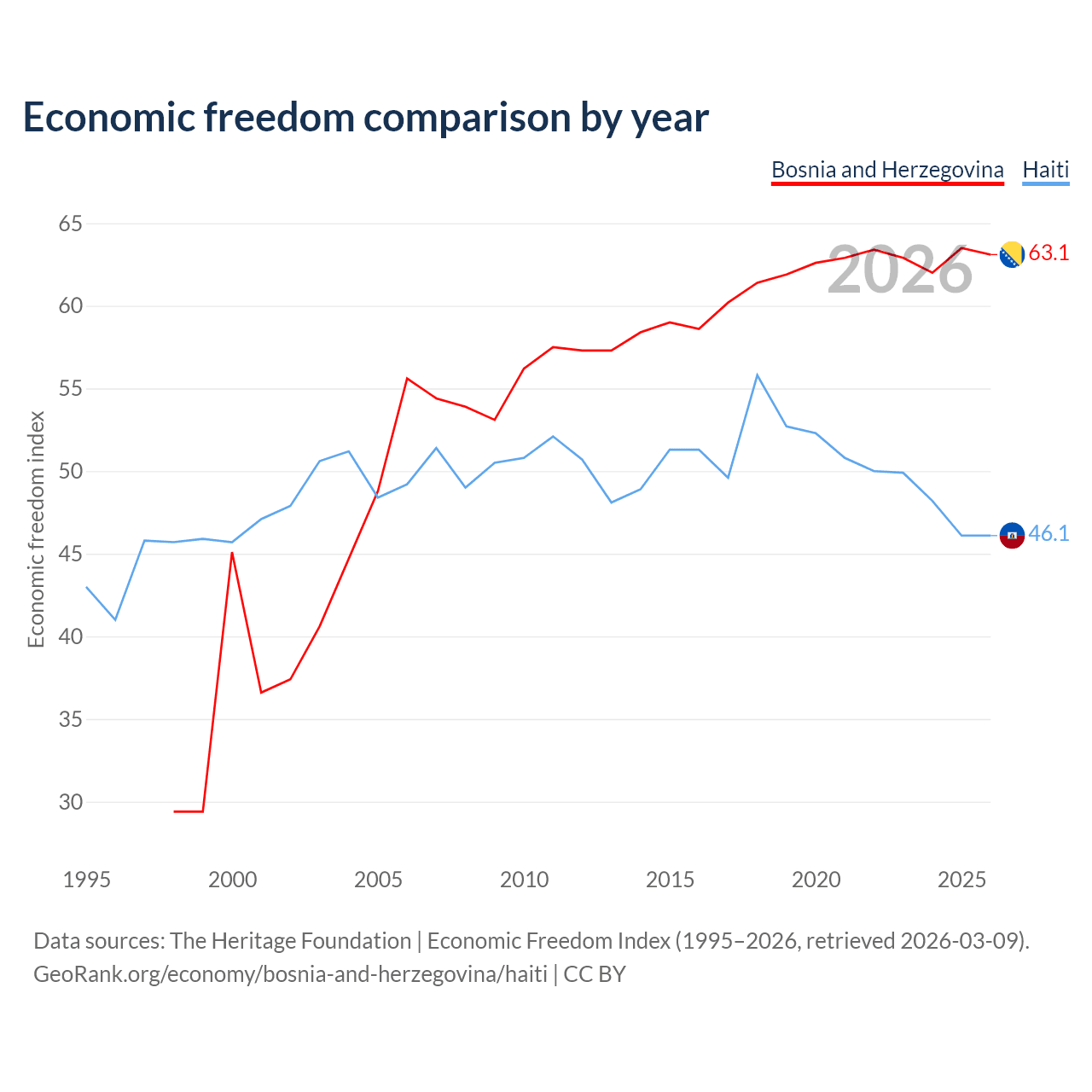 The Economic Freedom Index for Bosnia and Herzegovina is 63.1, ranking 83/197, compared to 46.1 for Haiti, ranking 178/197. The chart above displays a comparison of annual changes in economic freedom indexes.