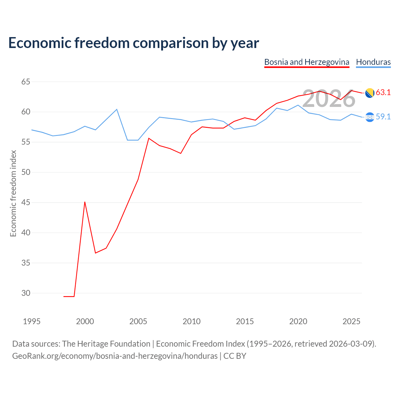 The Economic Freedom Index for Bosnia and Herzegovina is 63.1, ranking 83/197, compared to 59.1 for Honduras, ranking 105/197. The chart above displays a comparison of annual changes in economic freedom indexes.