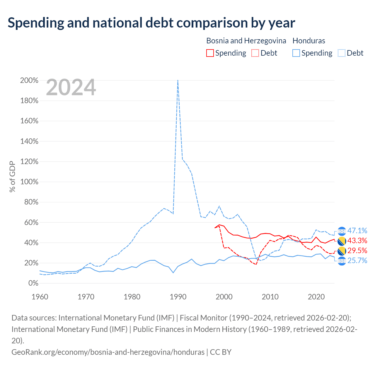 Bosnia and Herzegovina has $8.74B in government debt (29.5% of GDP), compared to $17.5B (47.1% of GDP) in Honduras.