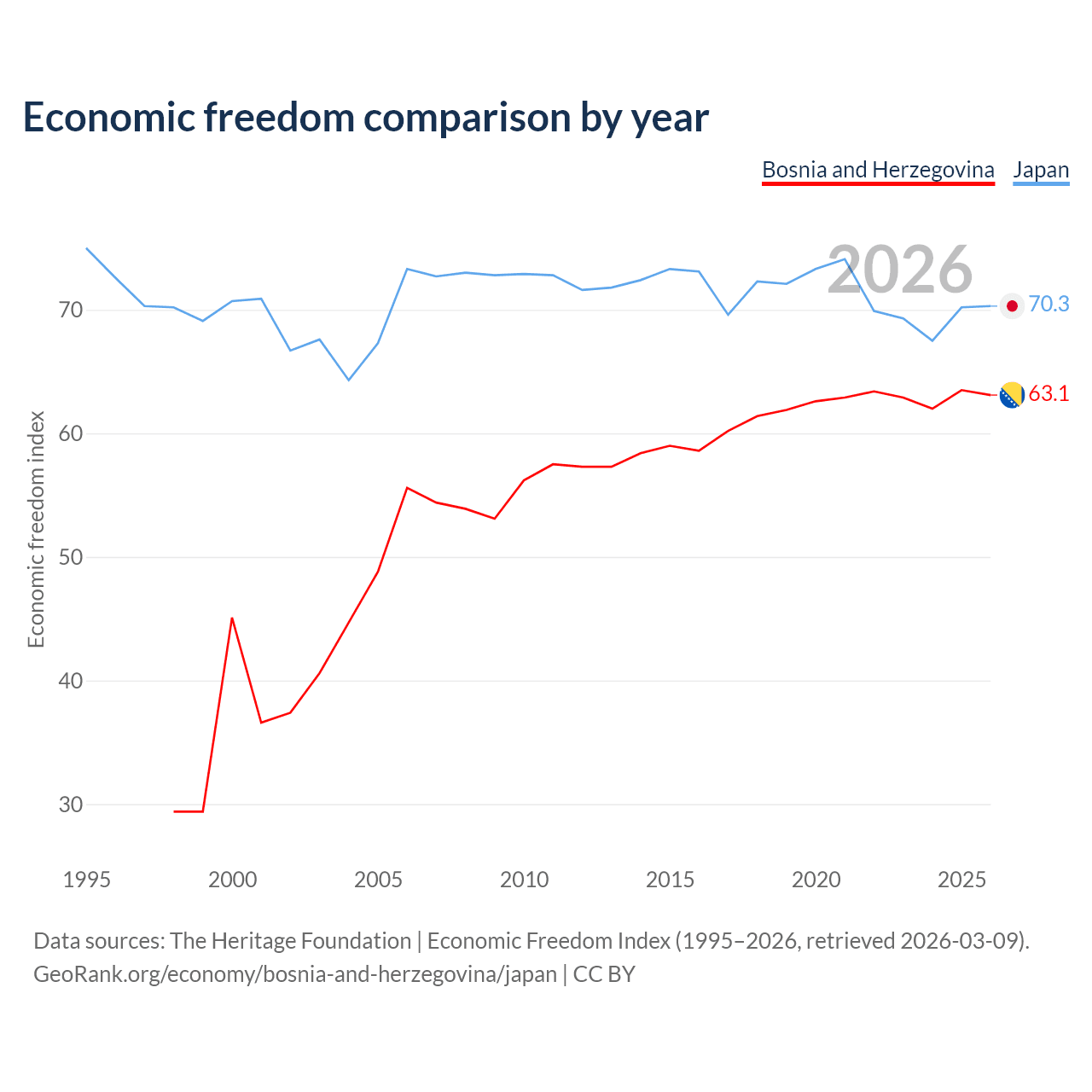 The Economic Freedom Index for Bosnia and Herzegovina is 63.1, ranking 83/197, compared to 70.3 for Japan, ranking 36/197. The chart above displays a comparison of annual changes in economic freedom indexes.