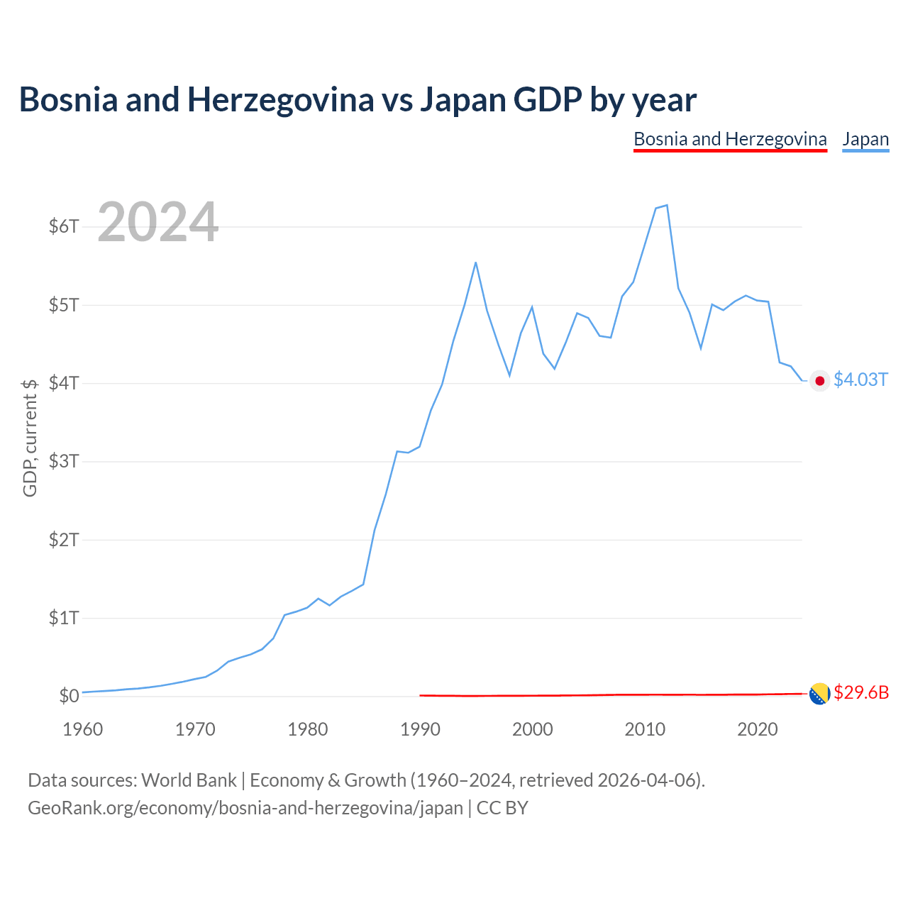 Bosnia and Herzegovina has a GDP of $29.6B compared to $4.03T for Japan, ranking 111/197 and 4/197 by economy size, respectively.