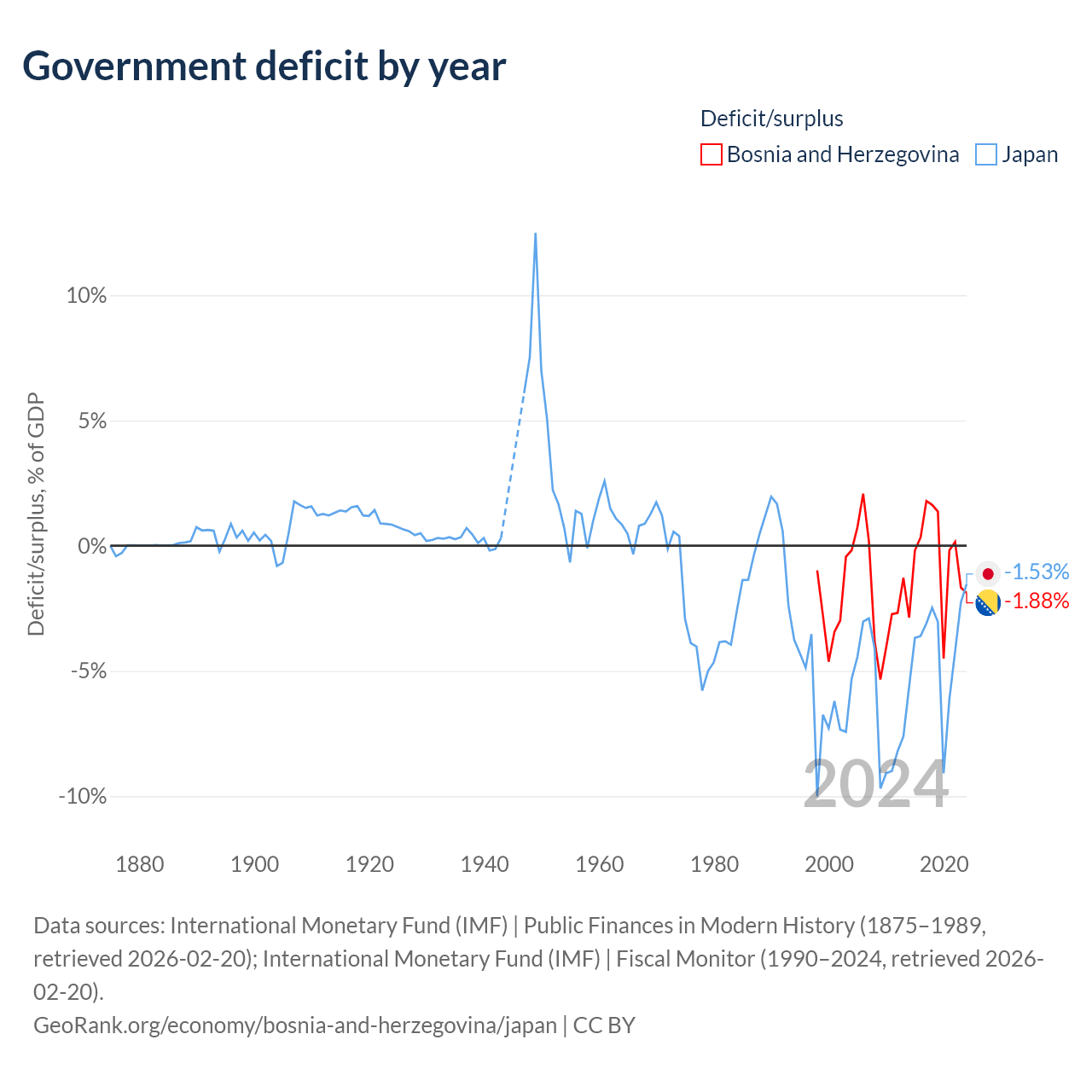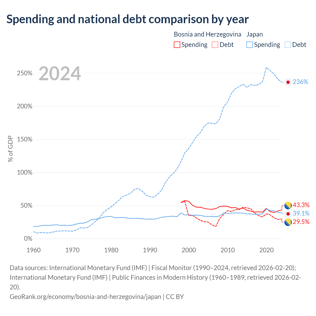 Bosnia and Herzegovina has $8.74B in government debt (29.5% of GDP), compared to $9.51T (236.1% of GDP) in Japan.