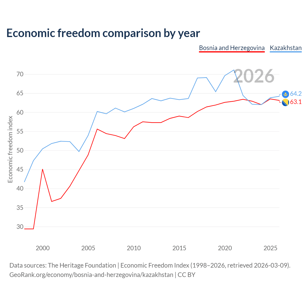 The Economic Freedom Index for Bosnia and Herzegovina is 63.1, ranking 83/197, compared to 64.2 for Kazakhstan, ranking 75/197. The chart above displays a comparison of annual changes in economic freedom indexes.