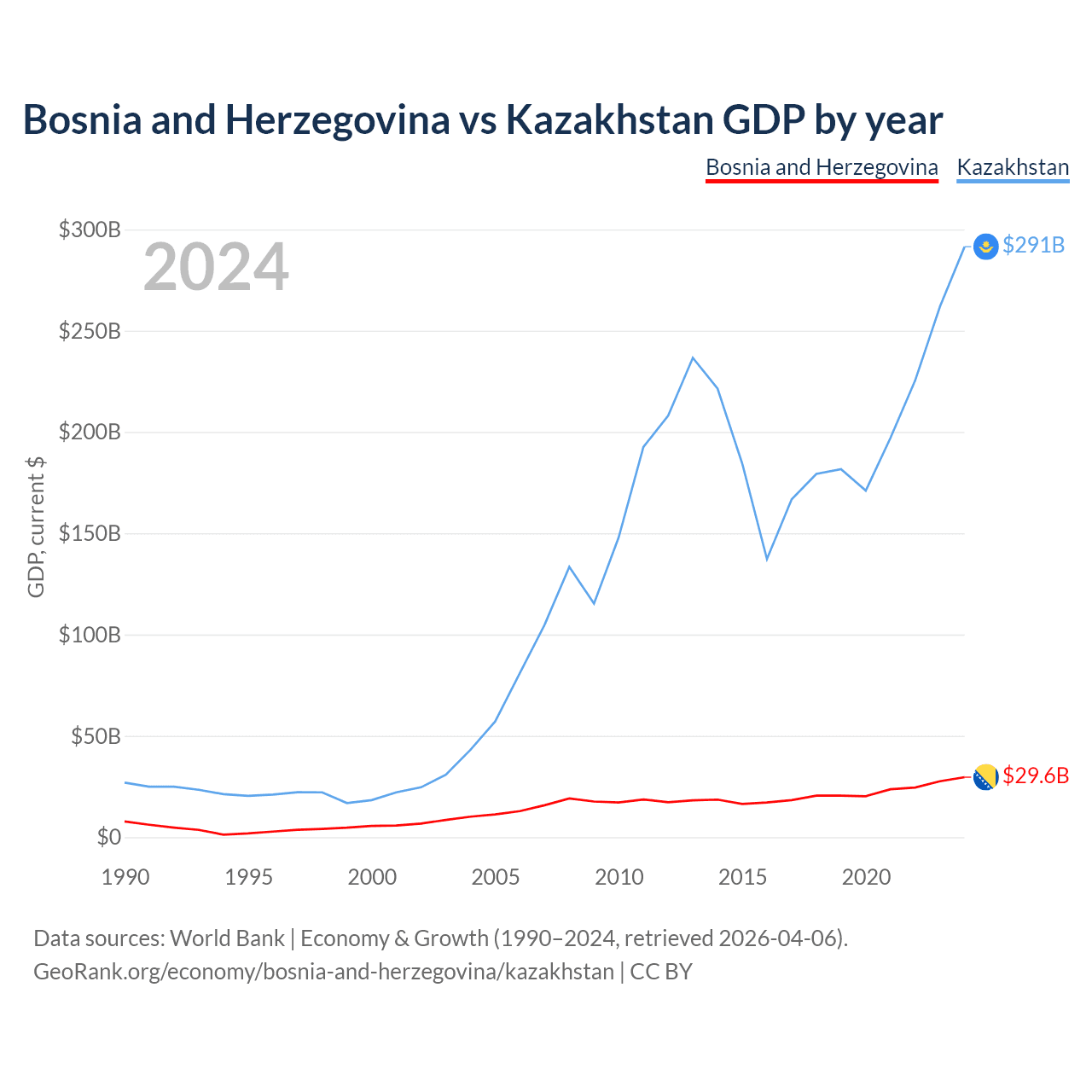 Bosnia and Herzegovina has a GDP of $29.6B compared to $291B for Kazakhstan, ranking 111/197 and 48/197 by economy size, respectively.