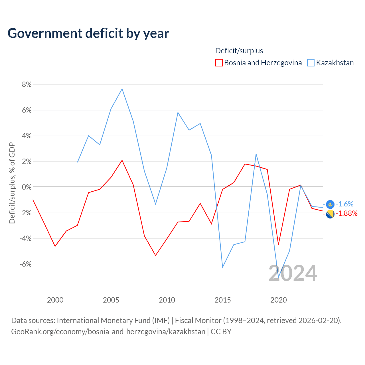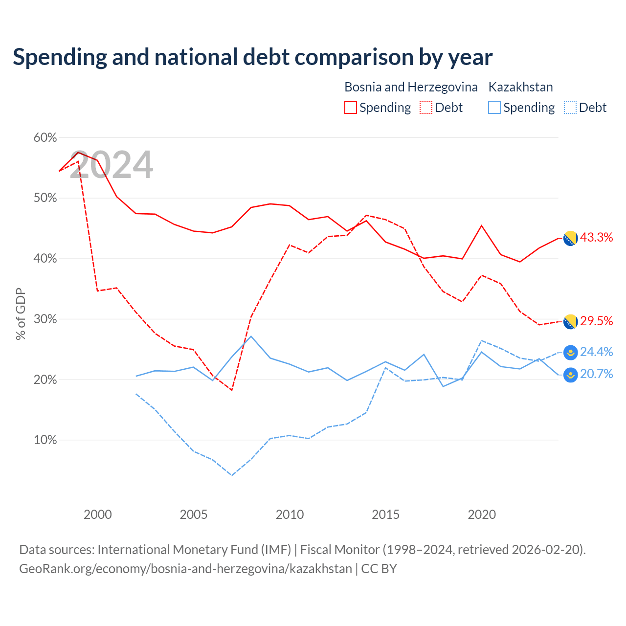 Bosnia and Herzegovina has $8.74B in government debt (29.5% of GDP), compared to $71.1B (24.4% of GDP) in Kazakhstan.