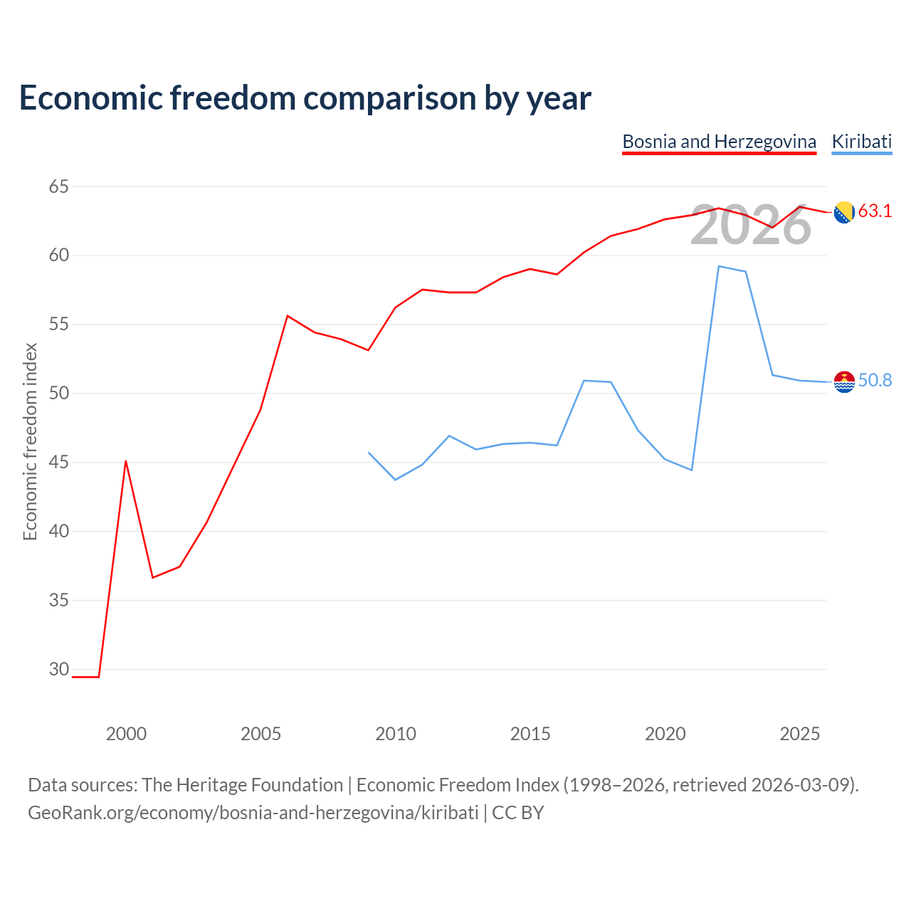 The Economic Freedom Index for Bosnia and Herzegovina is 63.1, ranking 83/197, compared to 50.8 for Kiribati, ranking 158/197. The chart above displays a comparison of annual changes in economic freedom indexes.