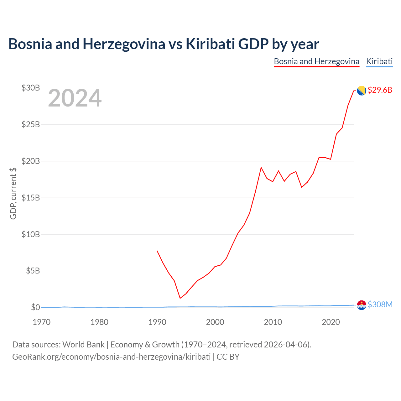 Bosnia and Herzegovina has a GDP of $29.6B compared to $308M for Kiribati, ranking 111/197 and 192/197 by economy size, respectively.