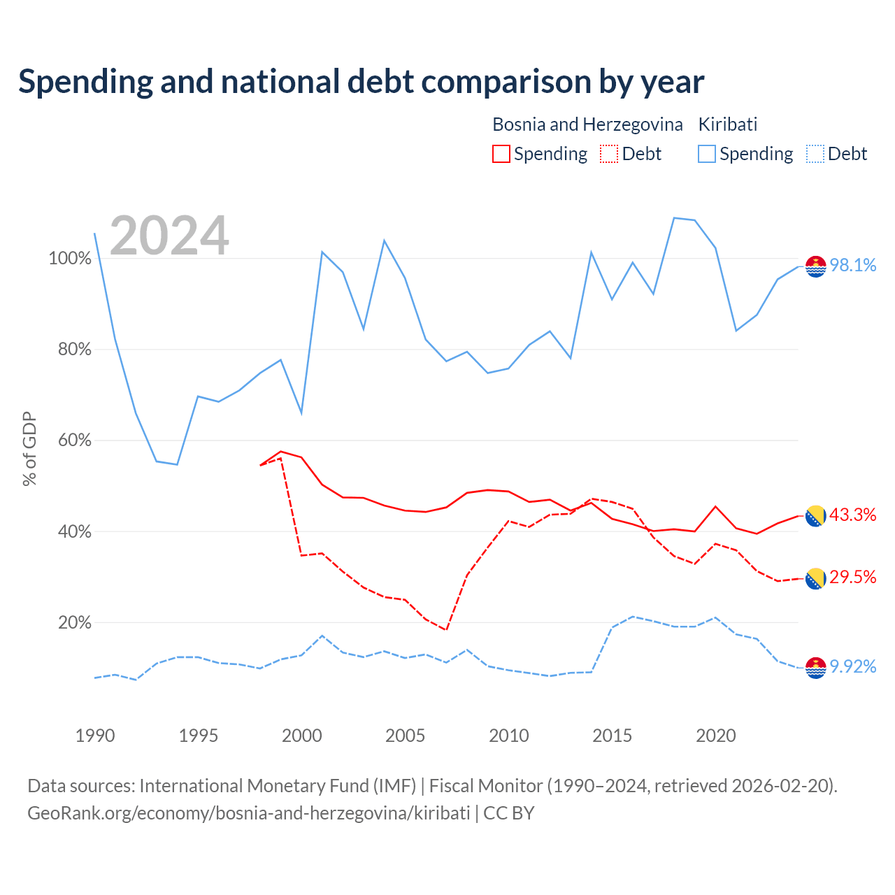 Bosnia and Herzegovina has $8.74B in government debt (29.5% of GDP), compared to $30.5M (9.92% of GDP) in Kiribati.