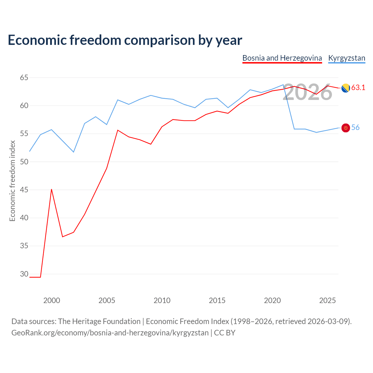 The Economic Freedom Index for Bosnia and Herzegovina is 63.1, ranking 83/197, compared to 56 for Kyrgyzstan, ranking 126/197. The chart above displays a comparison of annual changes in economic freedom indexes.