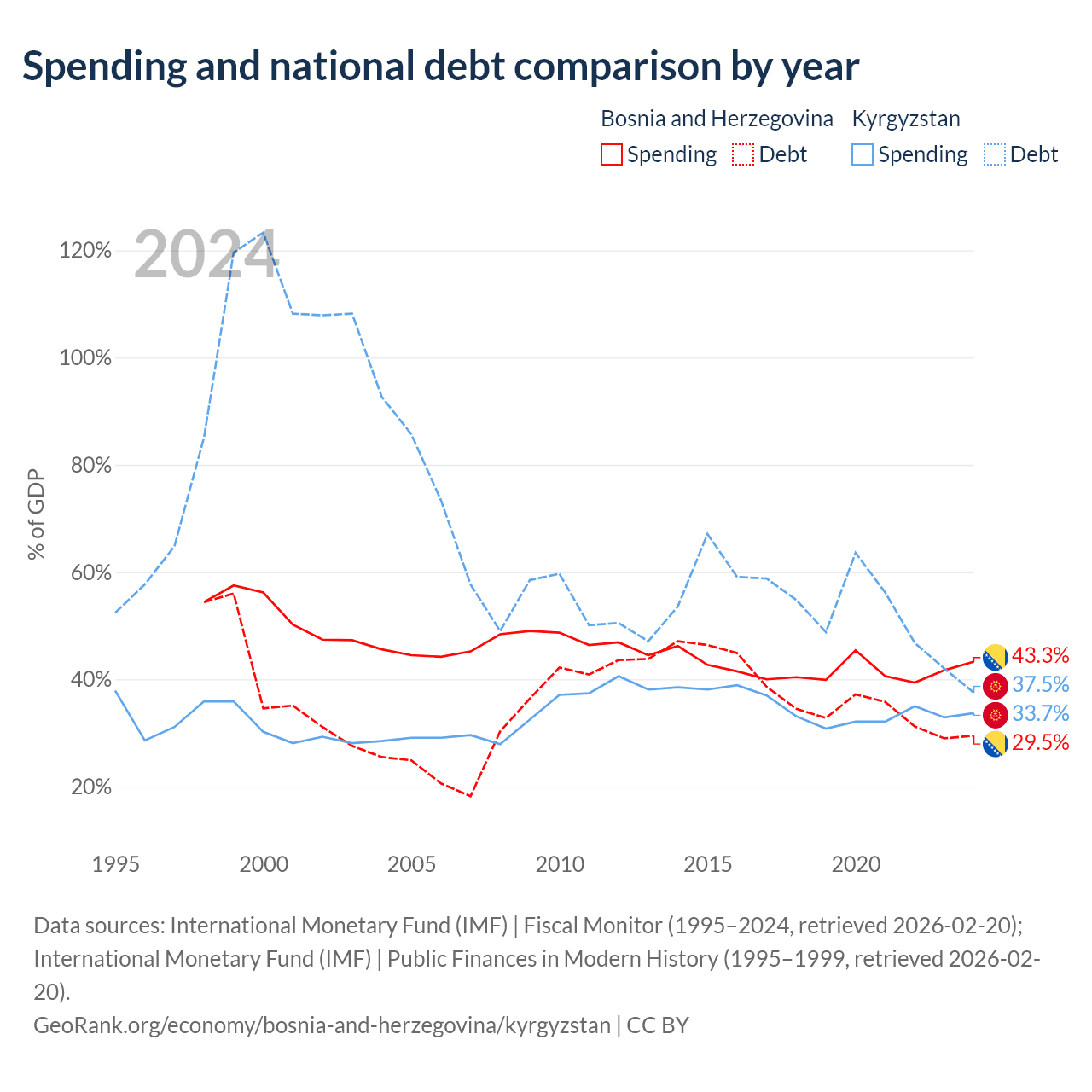 Bosnia and Herzegovina has $8.74B in government debt (29.5% of GDP), compared to $6.56B (37.5% of GDP) in Kyrgyzstan.