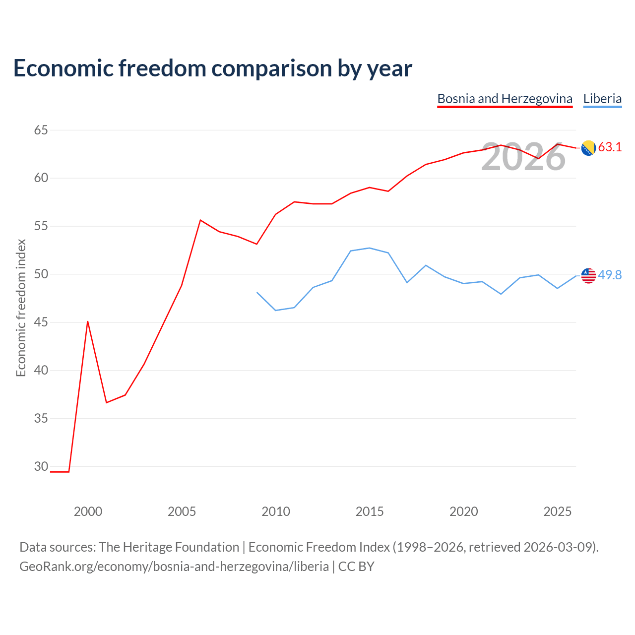 The Economic Freedom Index for Bosnia and Herzegovina is 63.1, ranking 83/197, compared to 49.8 for Liberia, ranking 163/197. The chart above displays a comparison of annual changes in economic freedom indexes.