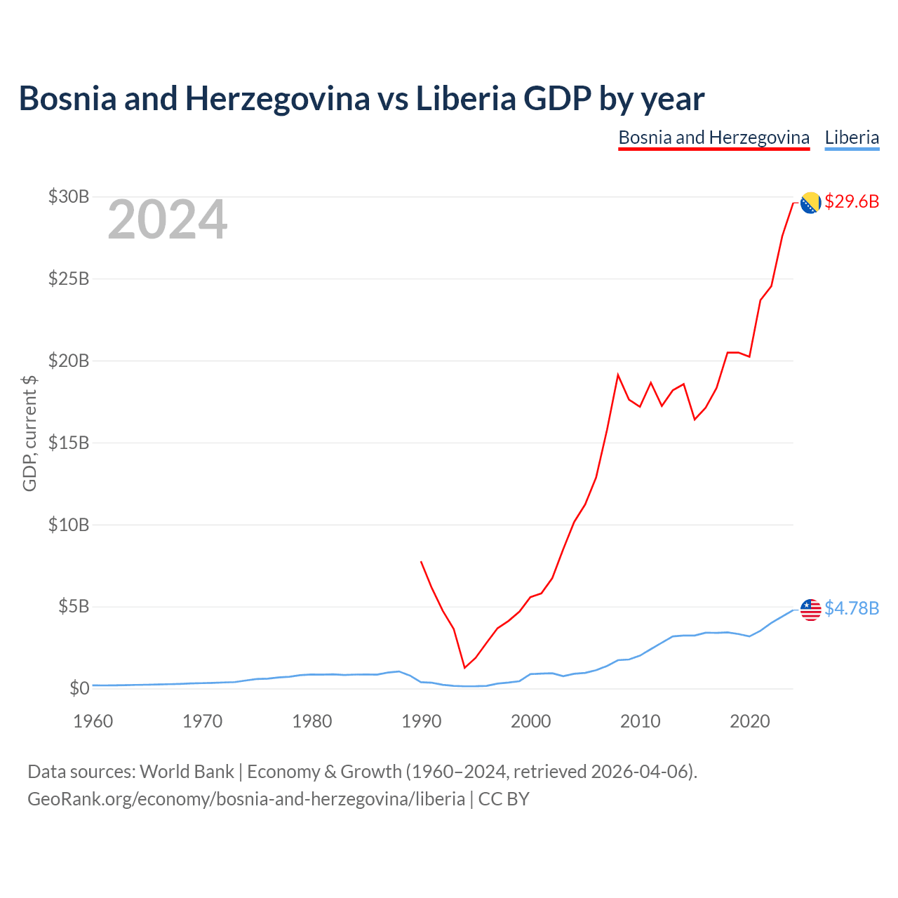 Bosnia and Herzegovina has a GDP of $29.6B compared to $4.78B for Liberia, ranking 111/197 and 163/197 by economy size, respectively.