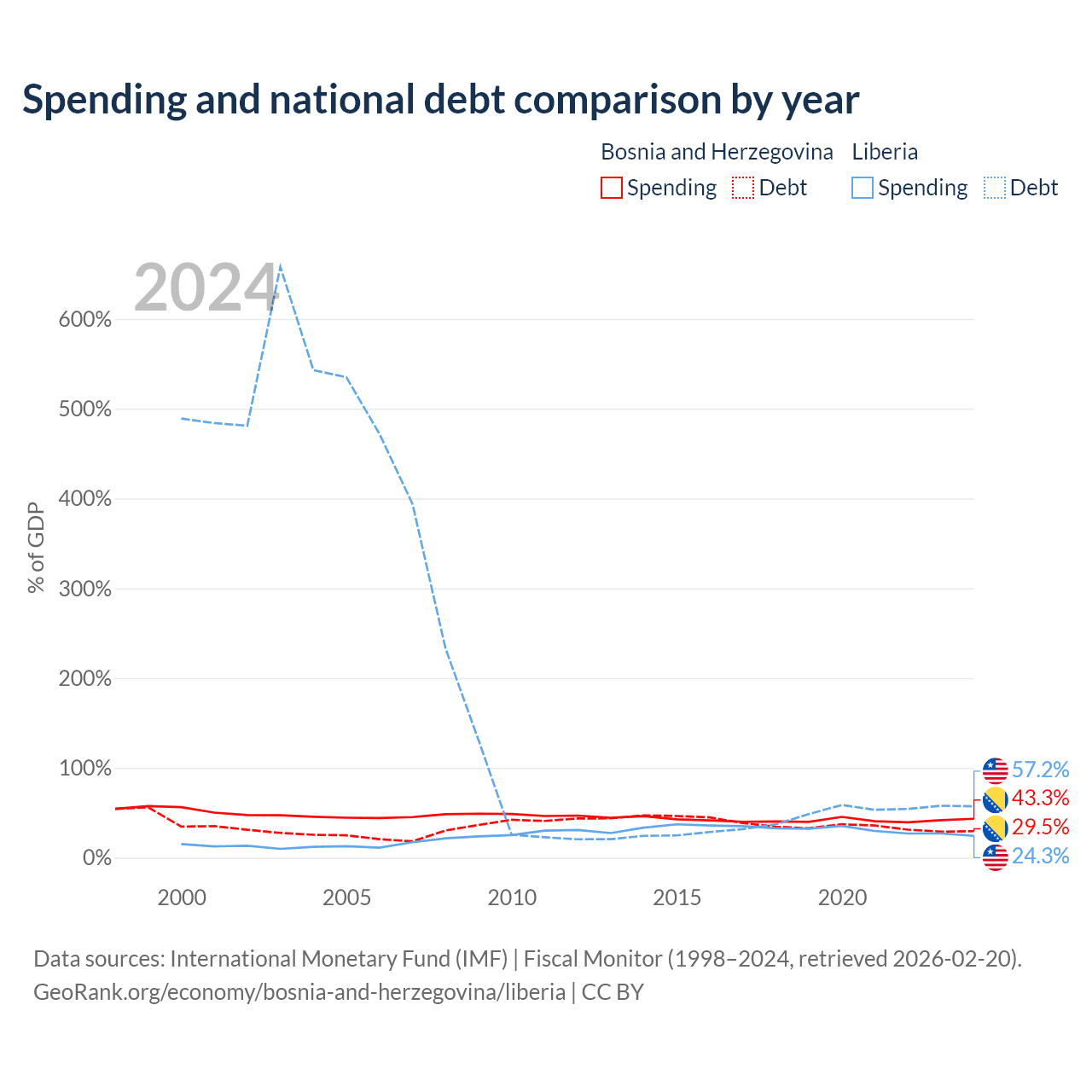 Bosnia and Herzegovina has $8.74B in government debt (29.5% of GDP), compared to $2.73B (57.2% of GDP) in Liberia.