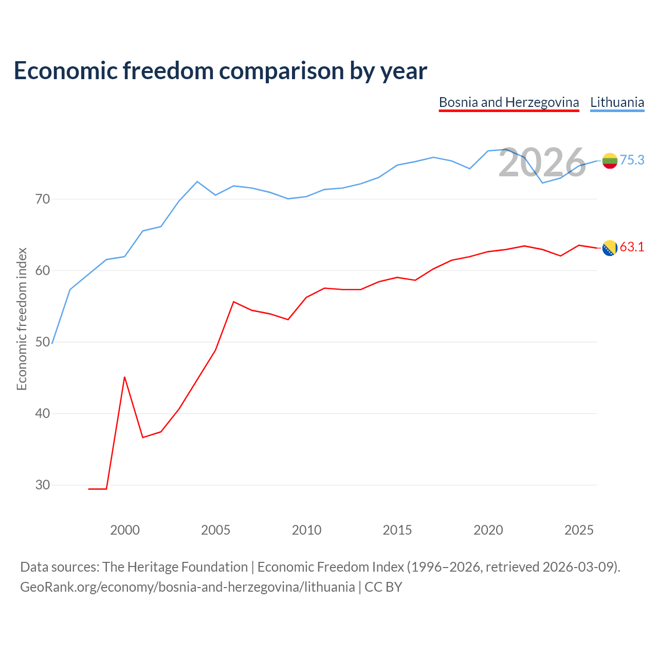The Economic Freedom Index for Bosnia and Herzegovina is 63.1, ranking 83/197, compared to 75.3 for Lithuania, ranking 18/197. The chart above displays a comparison of annual changes in economic freedom indexes.