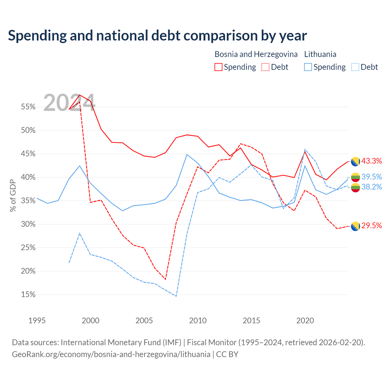 Bosnia and Herzegovina has $8.74B in government debt (29.5% of GDP), compared to $32.4B (38.2% of GDP) in Lithuania.